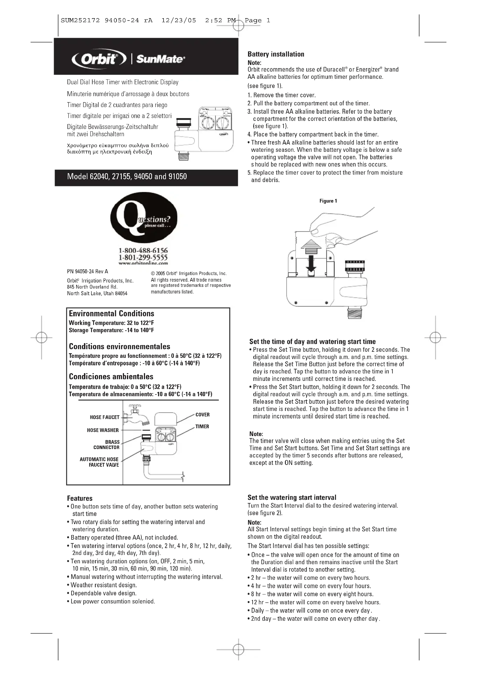 Téléchargez la notice de votre Programmateur d'arrosage au format PDF gratuitement ! Retrouvez votre notice SunMate 27155 - ORBIT et reprennez votre appareil électronique en main. Sur cette page sont publiés tous les documents nécessaires à l'utilisation de votre appareil SunMate 27155 de la marque ORBIT.