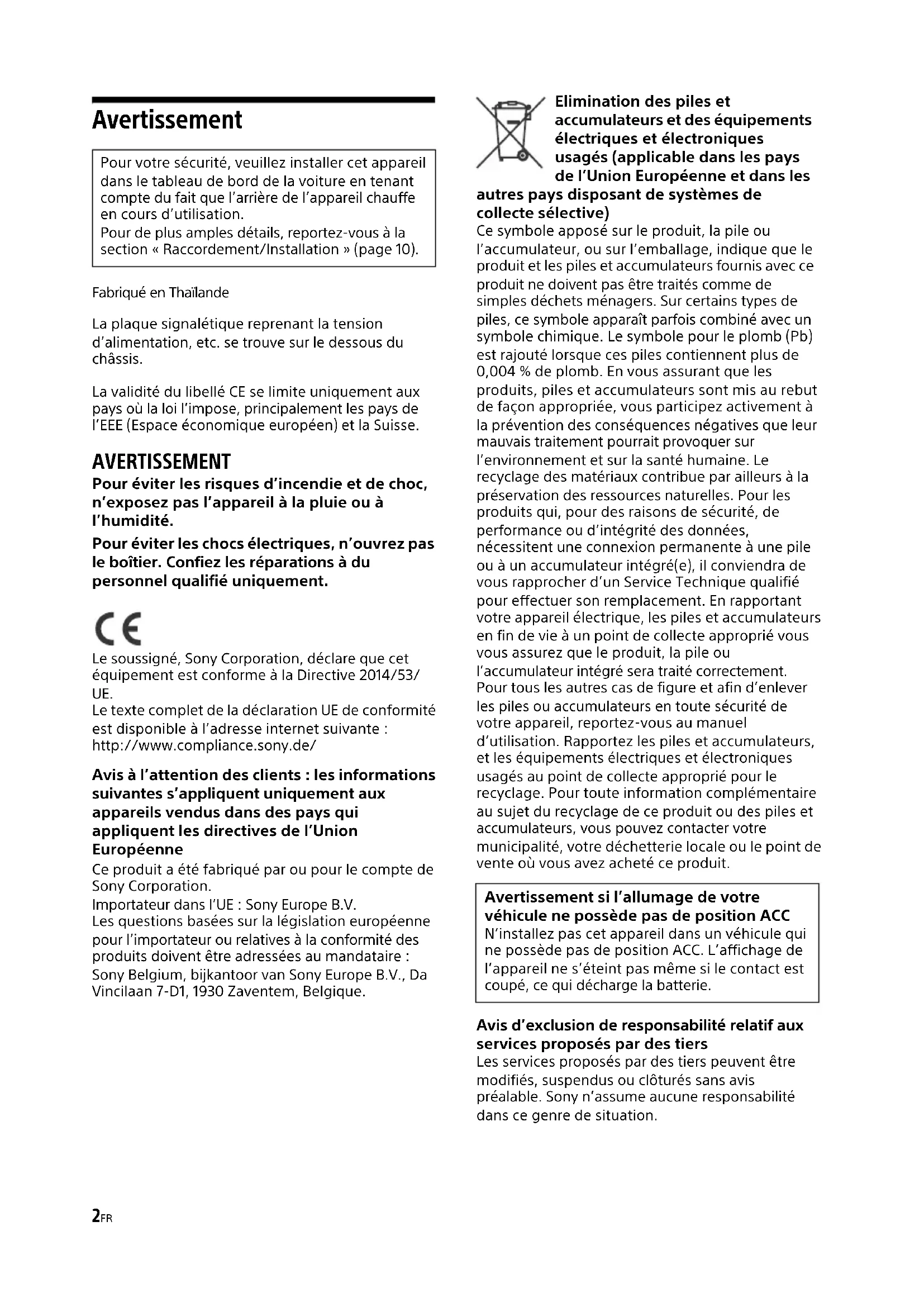 To the dashboard/center consoleParts supplied with your car BracketBracket15GB When replacing the fuse, be sure to use one matching the amperage rating stated on the original fuse. If the fuse blows, check the power connection and replace the fuse. If the fuse blows again after replacement, there may be an internal malfunction. In such a case, consult your nearest Sony dealer. Fuse replacement Fuse (10 A)2FR Avertissement Fabriqué en Thaïlande La plaque signalétique reprenant la tension d’alimentation, etc. se trouve sur le dessous du châssis. La validité du libellé CE se limite uniquement aux pays où la loi l’impose, principalement les pays de l’EEE (Espace économique européen) et la Suisse. AVERTISSEMENT Pour éviter les risques d’incendie et de choc, n’exposez pas l’appareil à la pluie ou à l’humidité. Pour éviter les chocs électriques, n’ouvrez pas le boîtier. Confiez les réparations à du personnel qualifié uniquement. Le soussigné, Sony Corporation, déclare que cet équipement est conforme à la Directive 2014/53/ UE. Le texte complet de la déclaration UE de conformité est disponible à l’adresse internet suivante : http://www.compliance.sony.de/ Avis à l’attention des clients : les informations suivantes s’appliquent uniquement aux appareils vendus dans des pays qui appliquent les directives de l’Union Européenne Ce produit a été fabriqué par ou pour le compte de Sony Corporation. Importateur dans l’UE : Sony Europe B.V. Les questions basées sur la législation européenne pour l’importateur ou relatives à la conformité des produits doivent être adressées au mandataire : Sony Belgium, bijkantoor van Sony Europe B.V., Da Vincilaan 7-D1, 1930 Zaventem, Belgique. Elimination des piles et accumulateurs et des équipements électriques et électroniques usagés (applicable dans les pays de l’Union Européenne et dans les autres pays disposant de systèmes de collecte sélective) Ce symbole apposé sur le produit, la pile ou l’accumulateur, ou sur l’emballage, indique que le produit et les piles et accumulateurs fournis avec ce produit ne doivent pas être traités comme de simples déchets ménagers. Sur certains types de piles, ce symbole apparaît parfois combiné avec un symbole chimique. Le symbole pour le plomb (Pb) est rajouté lorsque ces piles contiennent plus de 0,004 % de plomb. En vous assurant que les produits, piles et accumulateurs sont mis au rebut de façon appropriée, vous participez activement à la prévention des conséquences négatives que leur mauvais traitement pourrait provoquer sur l’environnement et sur la santé humaine. Le recyclage des matériaux contribue par ailleurs à la préservation des ressources naturelles. Pour les produits qui, pour des raisons de sécurité, de performance ou d’intégrité des données, nécessitent une connexion permanente à une pile ou à un accumulateur intégré(e), il conviendra de vous rapprocher d’un Service Technique qualifié pour effectuer son remplacement. En rapportant votre appareil électrique, les piles et accumulateurs en fin de vie à un point de collecte approprié vous vous assurez que le produit, la pile ou l’accumulateur intégré sera traité correctement. Pour tous les autres cas de figure et afin d’enlever les piles ou accumulateurs en toute sécurité de votre appareil, reportez-vous au manuel d’utilisation. Rapportez les piles et accumulateurs, et les équipements électriques et électroniques usagés au point de collecte approprié pour le recyclage. Pour toute information complémentaire au sujet du recyclage de ce produit ou des piles et accumulateurs, vous pouvez contacter votre municipalité, votre déchetterie locale ou le point de vente où vous avez acheté ce produit. Avis d’exclusion de responsabilité relatif aux services proposés par des tiers Les services proposés par des tiers peuvent être modifiés, suspendus ou clôturés sans avis préalable. Sony n’assume aucune responsabilité dans ce genre de situation. Pour votre sécurité, veuillez installer cet appareil dans le tableau de bord de la voiture en tenant compte du fait que l’arrière de l’appareil chauffe en cours d’utilisation. Pour de plus amples détails, reportez-vous à la section « Raccordement/Installation » (page 10). Avertissement si l’allumage de votre véhicule ne possède pas de position ACC N’installez pas cet appareil dans un véhicule qui ne possède pas de position ACC. L’affichage de l’appareil ne s’éteint pas même si le contact est coupé, ce qui décharge la batterie.3FR Attention SONY NE PEUT ÊTRE, EN AUCUN CAS, TENU POUR