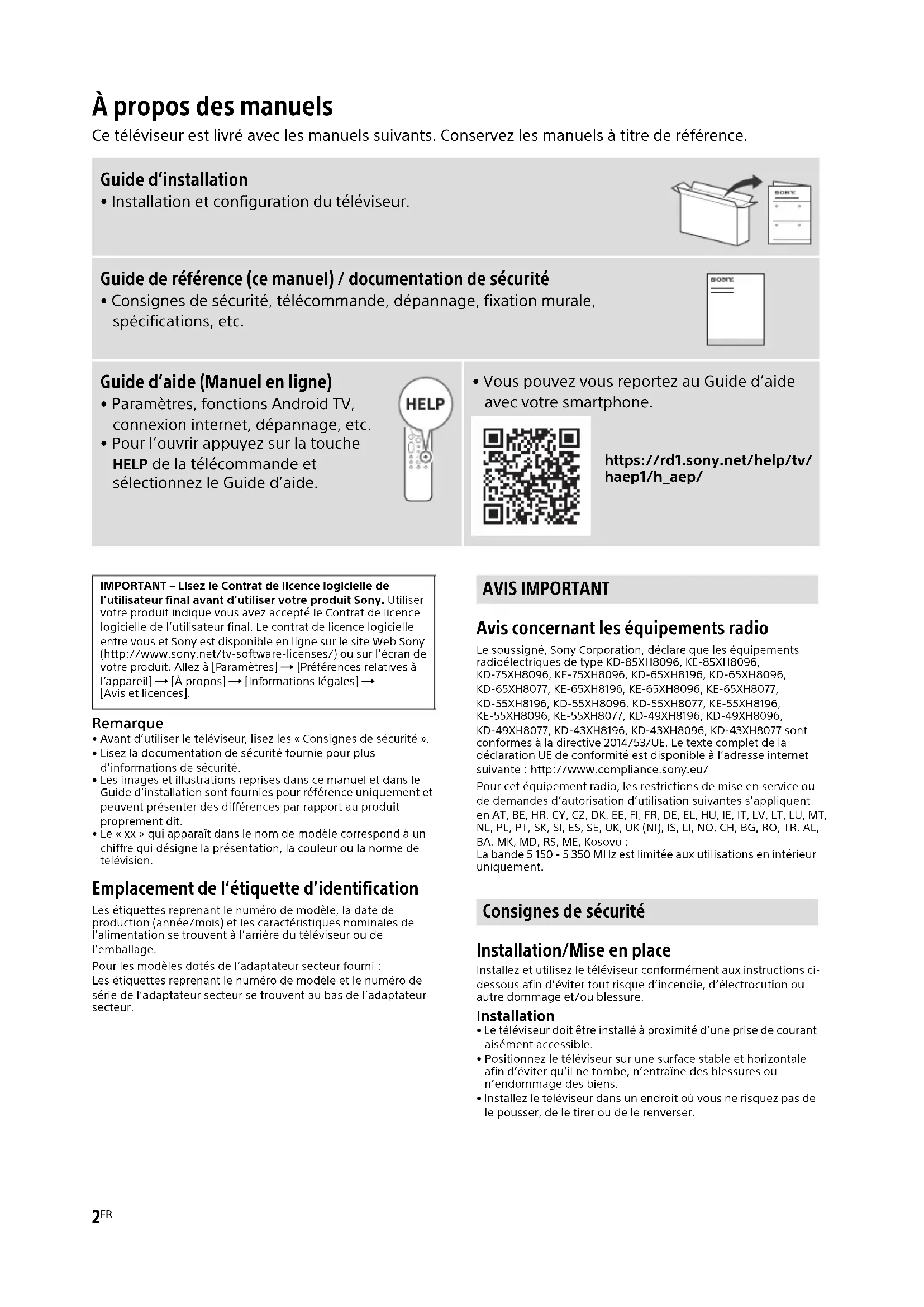- Le « xx » qui apparaît dans le nom de modèle correspond à un chiffre qui désigne la présentation, la couleur ou la norme de télévision. Emplacement de l’étiquette d’identification Les étiquettes reprenant le numéro de modèle, la date de production (année/mois) et les caractéristiques nominales de l’alimentation se trouvent à l’arrière du téléviseur ou de l’emballage. Pour les modèles dotés de l’adaptateur secteur fourni : Les étiquettes reprenant le numéro de modèle et le numéro de série de l’adaptateur secteur se trouvent au bas de l’adaptateur secteur. Avis concernant les équipements radio Le soussigné, Sony Corporation, déclare que les équipements radioélectriques de type KD-85XH8096, KE-85XH8096, KD-75XH8096, KE-75XH8096, KD-65XH8196, KD-65XH8096, KD-65XH8077, KE-65XH8196, KE-65XH8096, KE-65XH8077, KD-55XH8196, KD-55XH8096, KD-55XH8077, KE-55XH8196, KE-55XH8096, KE-55XH8077, KD-49XH8196, KD-49XH8096, KD-49XH8077, KD-43XH8196, KD-43XH8096, KD-43XH8077 sont conformes à la directive 2014/53/UE. Le texte complet de la déclaration UE de conformité est disponible à l’adresse internet suivante : http://www.compliance.sony.eu/ Pour cet équipement radio, les restrictions de mise en service ou de demandes d’autorisation d’utilisation suivantes s’appliquent en AT, BE, HR, CY, CZ, DK, EE, FI, FR, DE, EL, HU, IE, IT, LV, LT, LU, MT, NL, PL, PT, SK, SI, ES, SE, UK, UK (NI), IS, LI, NO, CH, BG, RO, TR, AL, BA, MK, MD, RS, ME, Kosovo : La bande 5 150 - 5 350 MHz est limitée aux utilisations en intérieur uniquement. Installation/Mise en place Installez et utilisez le téléviseur conformément aux instructions ci- dessous afin d’éviter tout risque d’incendie, d’électrocution ou autre dommage et/ou blessure. Installation