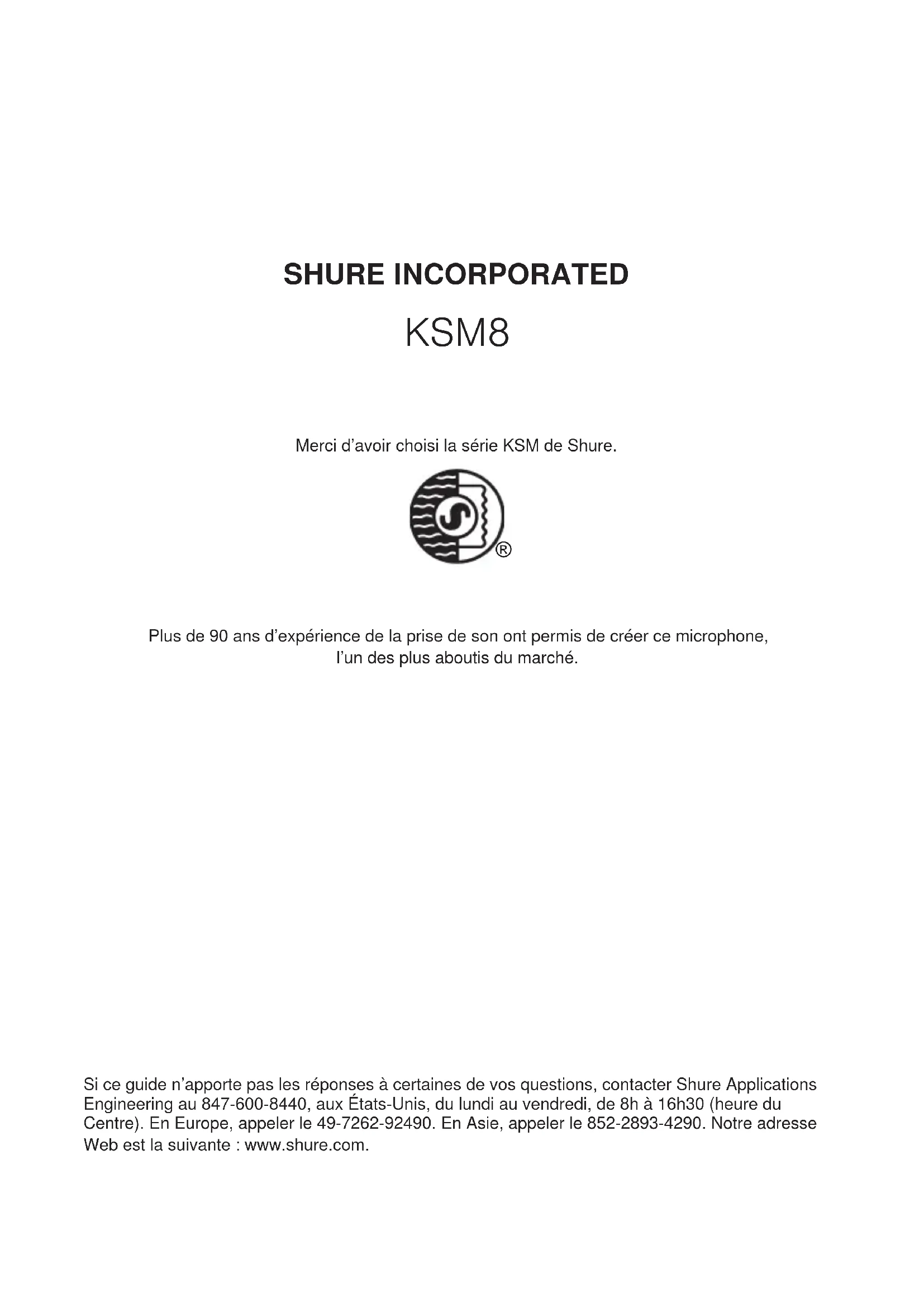 Plus de 90 ans d’expérience de la prise de son ont permis de créer ce microphone, l’un des plus aboutis du marché. Si ce guide n’apporte pas les réponses à certaines de vos questions, contacter Shure Applications Engineering au 847-600-8440, aux États-Unis, du lundi au vendredi, de 8h à 16h30 (heure du Centre). En Europe, appeler le 49-7262-92490. En Asie, appeler le 852-2893-4290. Notre adresse Web est la suivante : www.shure.com.8 Microphone Dualdyne™ KSM8 Description générale Le microphone Dualdyne™ KSM8 de Shure est le premier microphone électrodynamique à double diaphragme à main au monde, conçu pour les applications vocales professionnelles sur scène et en studio. Shure a porté la technologie et les performances des microphones électrodynamiques vers des sommets jamais atteints avec le développement du Dualdyne KSM8 haut de gamme. Capable de produire un niveau de sortie supérieur tout en réduisant l’effet de proximité à un degré inégalé, ce microphone fournit un signal pur hautement détaillé avec un Larsen minimum. Chaque Dualdyne KSM8, à la fabrication ultramoderne basée sur des composants haut de gamme, a été façonné et testé avec une grande minutie pour répondre aux normes de qualité de la construction Shure de renommée internationale, même dans les conditions les plus difficiles du direct. Variantes Le microphone KSM8 est disponible en fini noir ou argent brossé. Il peut également être acheté au sein d’un système sans fil Shure ou pour compléter un émetteur à main sans fil existant. KSM8/B : microphone électrodynamique à double diaphragme haute qualité à fini noir. KSM8/N : microphone électrodynamique à double diaphragme haute qualité à fini argent brossé. Caractéristiques La capsule à double diaphragme assure une réponse plus homogène sur le spectre de fréquences lorsque la distance entre le microphone et la source change. Une technologie révolutionnaire qui offre les avantages suivants :