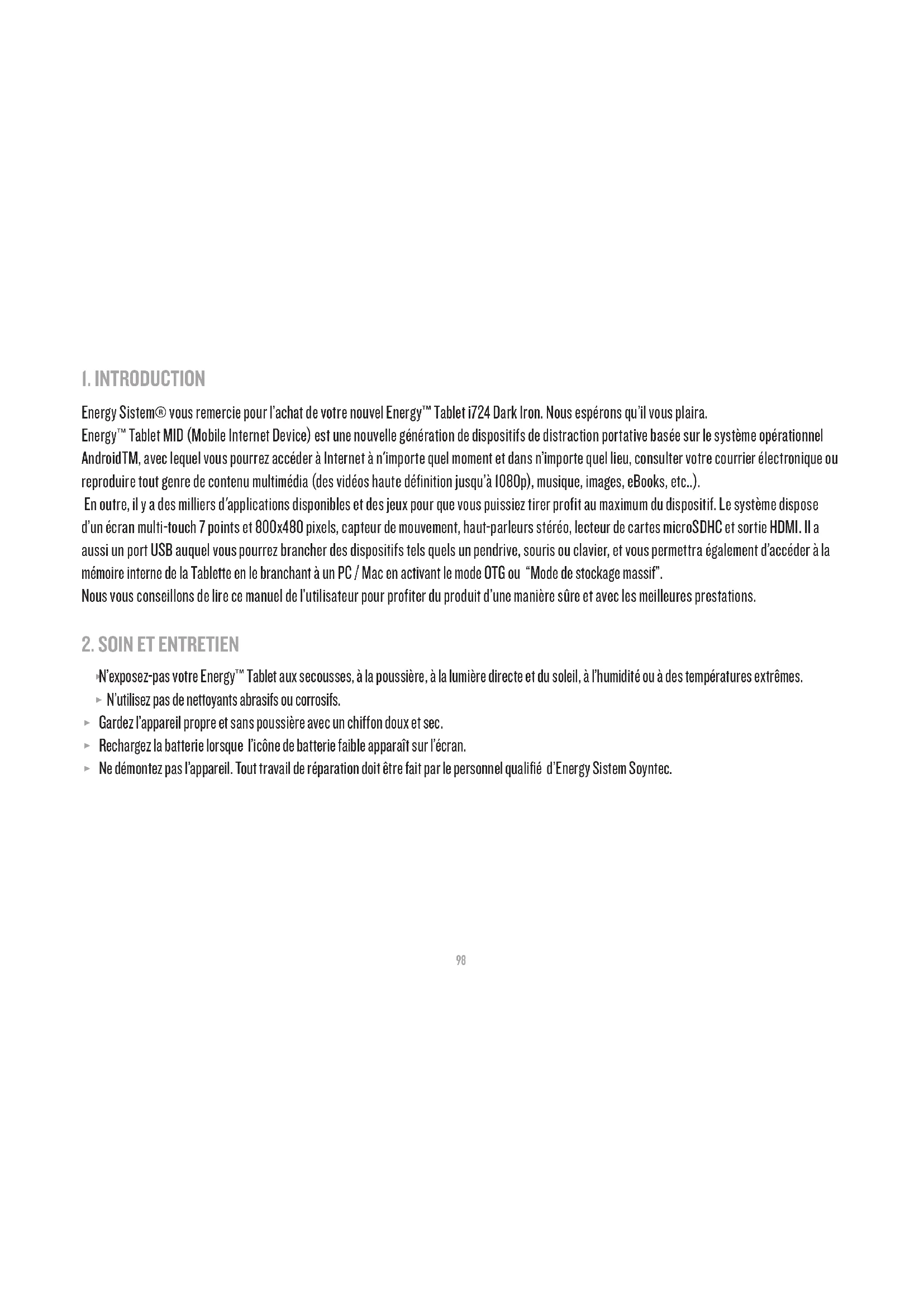 Energy Sistem® vous remercie pour l'achat de votre nouvel Energy™ Tablet i724 Dark Iron. Nous espérons qu'il vous plaira.