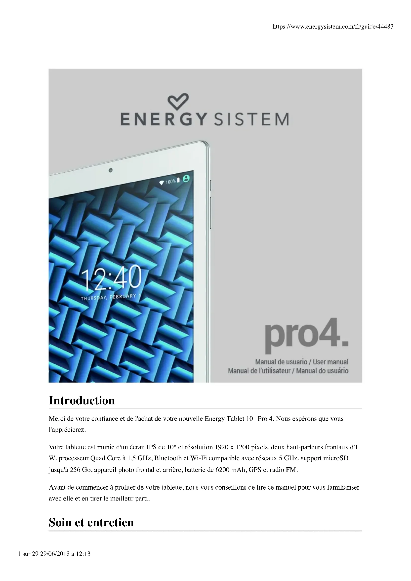 Introduction Merci de votre confiance et de l'achat de votre nouvelle Energy Tablet 10" Pro 4. Nous espérons que vous l'apprécierez. Votre tablette est munie d'un écran IPS de 10" et résolution 1920 x 1200 pixels, deux haut-parleurs frontaux d'1 W, processeur Quad Core à 1,5 GHz, Bluetooth et Wi-Fi compatible avec réseaux 5 GHz, support microSD jusqu'à 256 Go, appareil photo frontal et arrière, batterie de 6200 mAh, GPS et radio FM. Avant de commencer à profiter de votre tablette, nous vous conseillons de lire ce manuel pour vous familiariser avec elle et en tirer le meilleur parti. Soin et entretien https://www.energysistem.com/fr/guide/44483 1 sur 29 29/06/2018 à 12:13Ne pas exposer votre tablette à des chocs, à la poussière, à la lumière directe du soleil, à l'humidité ou à hautes températures. Ne pas utiliser des produits corrosifs ou abrasifs. Gardez l'appareil propre et sans poussière avec un chiffon doux et sec. Ne pas laisser la batterie de votre tablette complètement déchargée pendant une longue période. Utilisez toujours le chargeur fourni ou un autre chargeur ayant les mêmes caractéristiques. Ne pas démonter l'appareil. Toute réparation doit être exclusivement réalisée par le personnel qualifié d'Energy Sistem Technology, S.A. Caractéristiques principales ÉCRAN Affichage IPS LED rétroéclairé de 10.1" Format large 16:10 Résolution Full HD 1920 x 1200 pixels Revêtement anti-traces PROCESSEUR Processeur Quad Core ARM Cortex A53 1,5 GHz GPU Mali-T720