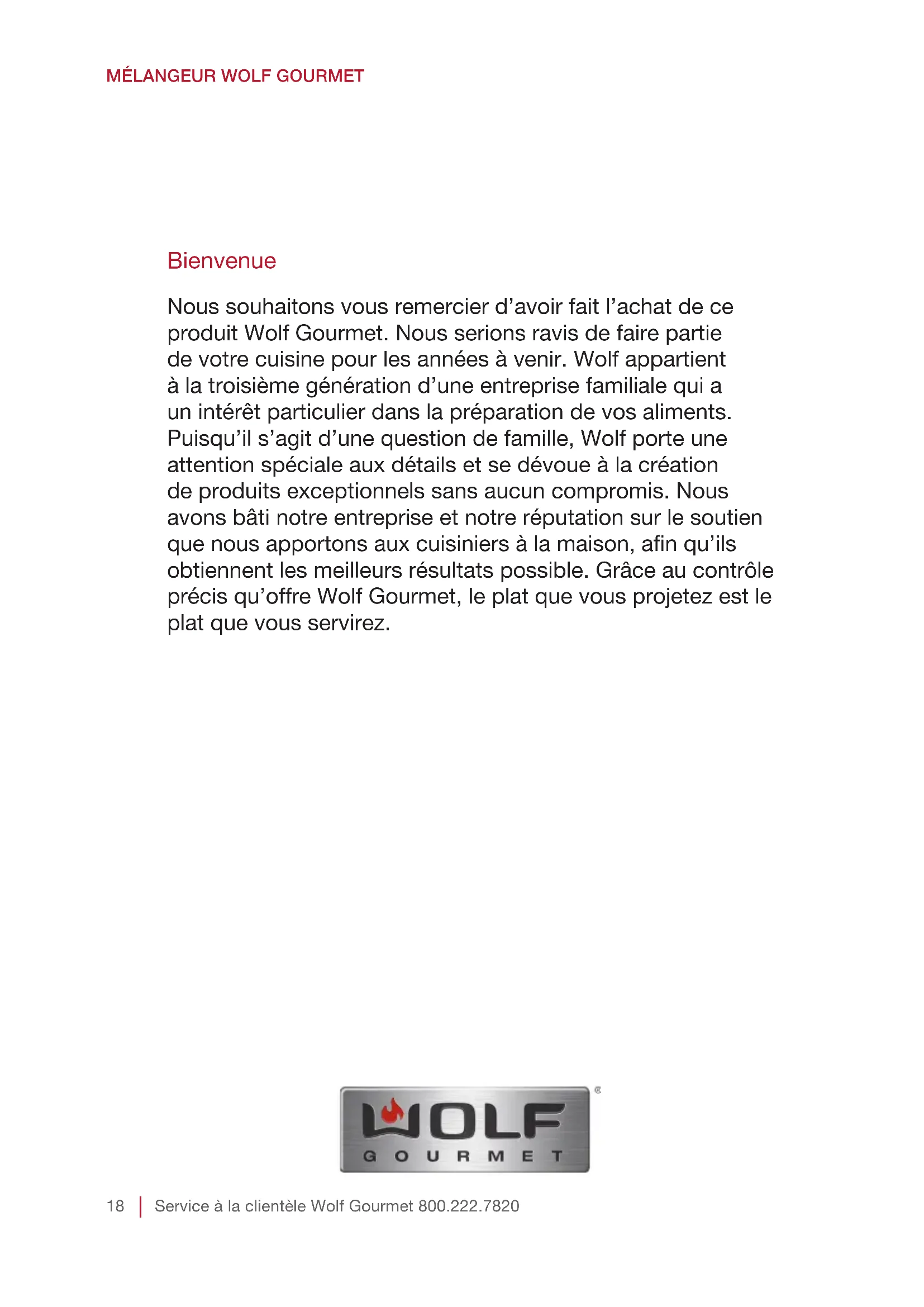 your product’s rating label. 840246902 ENv02.indd 17 3/3/15 10:03 AMMÉLANGEUR WOLF GOURMET Bienvenue Nous souhaitons vous remercier d’avoir fait l’achat de ce produit Wolf Gourmet. Nous serions ravis de faire partie de votre cuisine pour les années à venir. Wolf appartient à la troisième génération d’une entreprise familiale qui a un intérêt particulier dans la préparation de vos aliments. Puisqu’il s’agit d’une question de famille, Wolf porte une attention spéciale aux détails et se dévoue à la création de produits exceptionnels sans aucun compromis. Nous avons bâti notre entreprise et notre réputation sur le soutien que nous apportons aux cuisiniers à la maison, an qu’ils obtiennent les meilleurs résultats possible. Grâce au contrôle précis qu’offre Wolf Gourmet, le plat que vous projetez est le plat que vous servirez.