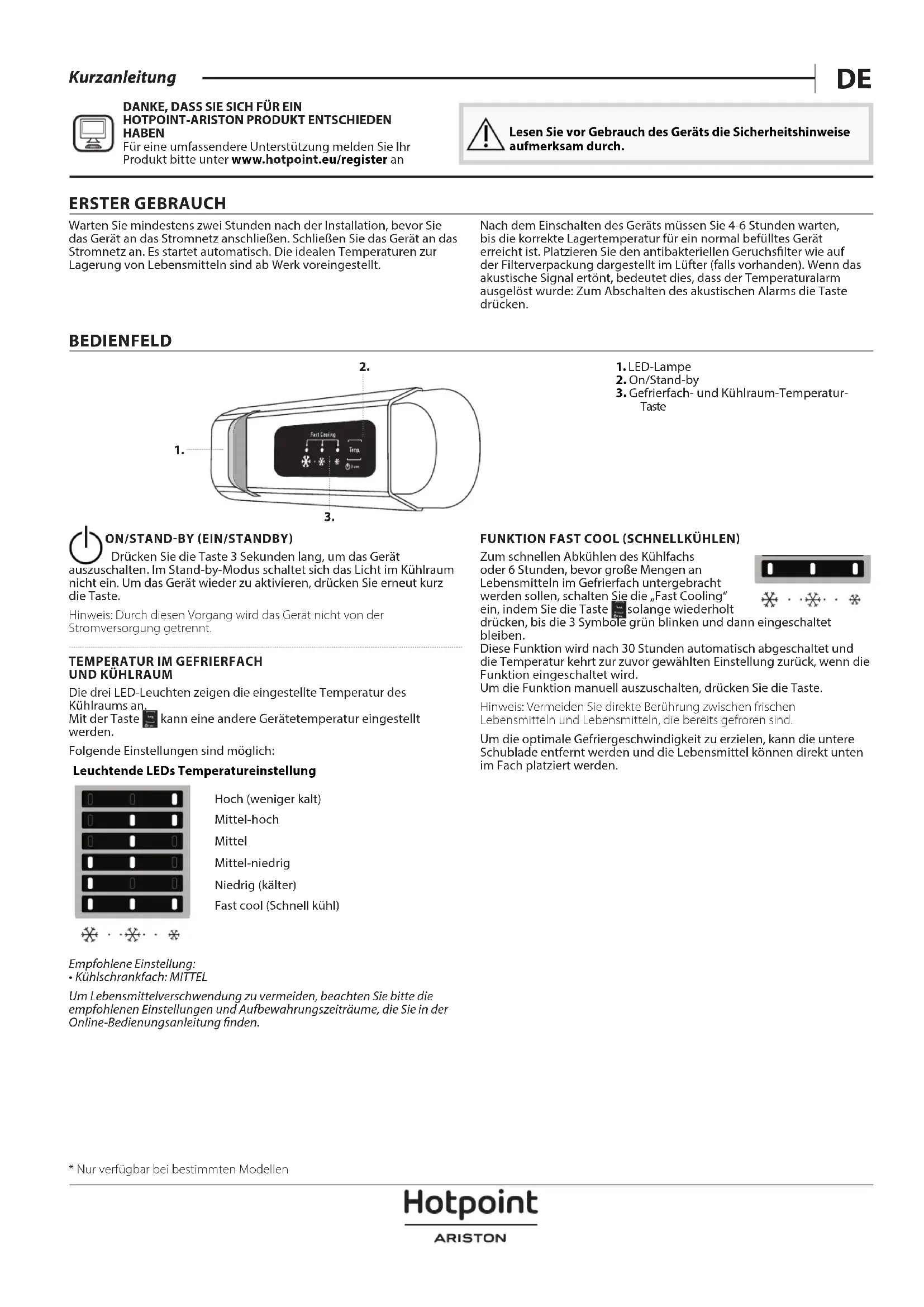 PRODUIT HOTPOINT-ARISTON An de proter d’une assistance complète, veuillez enregistrer votre produit sur www . hotpoint .eu/ register Lisez attentivement les instructions avant d’utiliser l’appareil. 1ÈRE UTILISATION Attendre au moins deux heures après l’installation avant de brancher l’appareil à l’alimentation électrique. Brancher le four à l’alimentation électrique démarre le fonctionnement automatiquement. Les températures idéales de stockage des aliments sont préréglées en usine. Après avoir allumé l’appareil, vous devez patienter de 4 à 6 heures pour atteindre la température de conservation appropriée pour un appareil normalement rempli. Selon le modèle, placez le ltre anti-odeurs et antibactérien dans le ventilateur comme illustré sur l’emballage du ltre. Si le signal sonore retentit, cela signie que l’alarme de température est intervenue: appuyez sur le bouton pour éteindre les alarmes sonores.