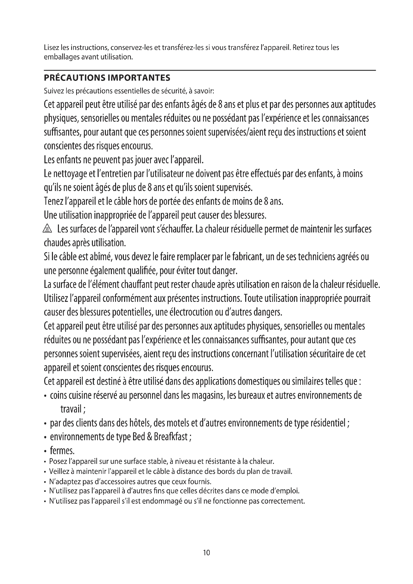 Suivez les précautions essentielles de sécurité, à savoir: Cet appareil peut être utilisé par des enfants âgés de 8 ans et plus et par des personnes aux aptitudes physiques, sensorielles ou mentales réduites ou ne possédant pas l’expérience et les connaissances susantes, pour autant que ces personnes soient supervisées/aient reçu des instructions et soient conscientes des risques encourus. Les enfants ne peuvent pas jouer avec l’appareil. Le nettoyage et l’entretien par l’utilisateur ne doivent pas être eectués par des enfants, à moins qu’ils ne soient âgés de plus de 8 ans et qu’ils soient supervisés. Tenez l’appareil et le câble hors de portée des enfants de moins de 8 ans. Une utilisation inappropriée de l’appareil peut causer des blessures. h Les surfaces de l’appareil vont s’échauer. La chaleur résiduelle permet de maintenir les surfaces chaudes après utilisation. Si le câble est abîmé, vous devez le faire remplacer par le fabricant, un de ses techniciens agréés ou une personne également qualiée, pour éviter tout danger. La surface de l’élément chauant peut rester chaude après utilisation en raison de la chaleur résiduelle. Utilisez l’appareil conformément aux présentes instructions. Toute utilisation inappropriée pourrait causer des blessures potentielles, une électrocution ou d’autres dangers. Cet appareil peut être utilisé par des personnes aux aptitudes physiques, sensorielles ou mentales réduites ou ne possédant pas l’expérience et les connaissances susantes, pour autant que ces personnes soient supervisées, aient reçu des instructions concernant l’utilisation sécuritaire de cet appareil et soient conscientes des risques encourus. Cet appareil est destiné à être utilisé dans des applications domestiques ou similaires telles que :