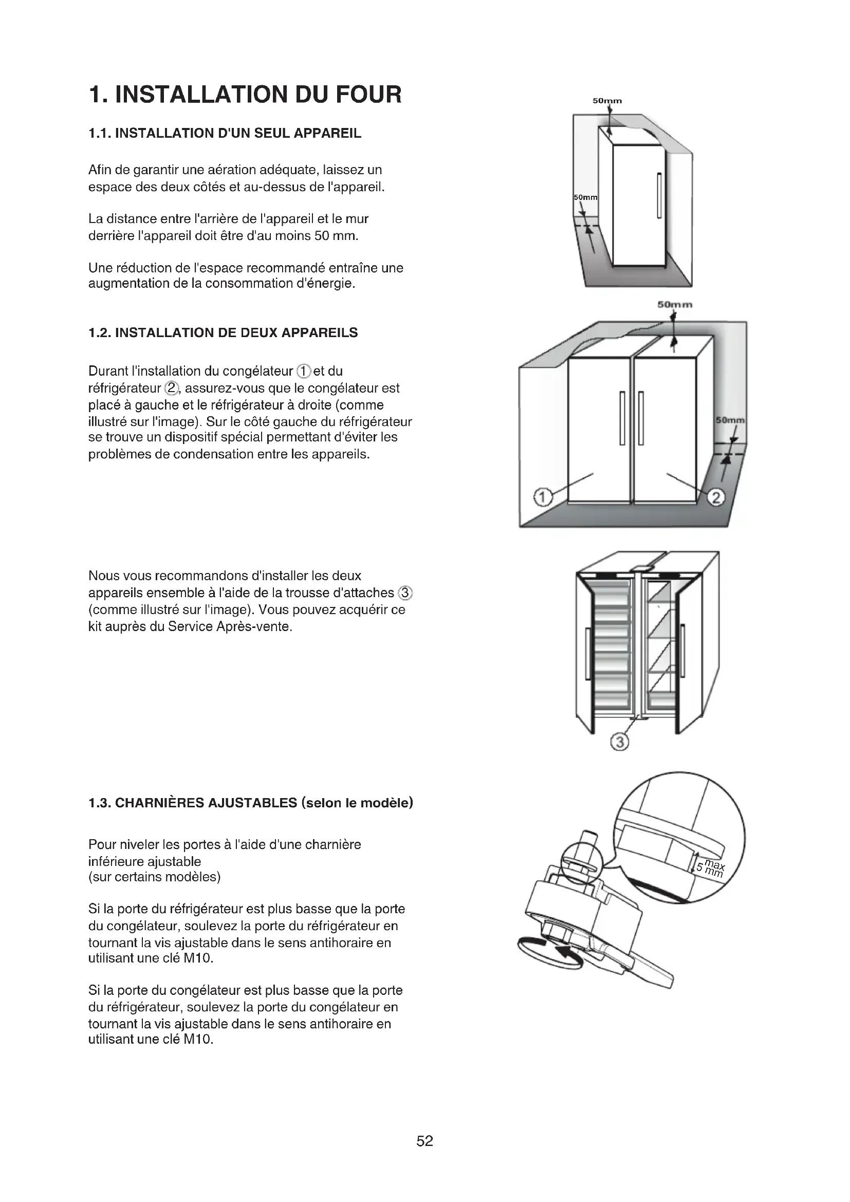 (comme illustré sur l'image). Vous pouvez acquérir ce kit auprès du Service Après-vente. 1.3. CHARNIÈRES AJUSTABLES (selon le modèle) Pour niveler les portes à l'aide d'une charnière inférieure ajustable (sur certains modèles) Si la porte du réfrigérateur est plus basse que la porte du congélateur, soulevez la porte du réfrigérateur en tournant la vis ajustable dans le sens antihoraire en utilisant une clé M10. Si la porte du congélateur est plus basse que la porte du réfrigérateur, soulevez la porte du congélateur en tournant la vis ajustable dans le sens antihoraire en utilisant une clé M10. 50mm 50mm 5 mm max53