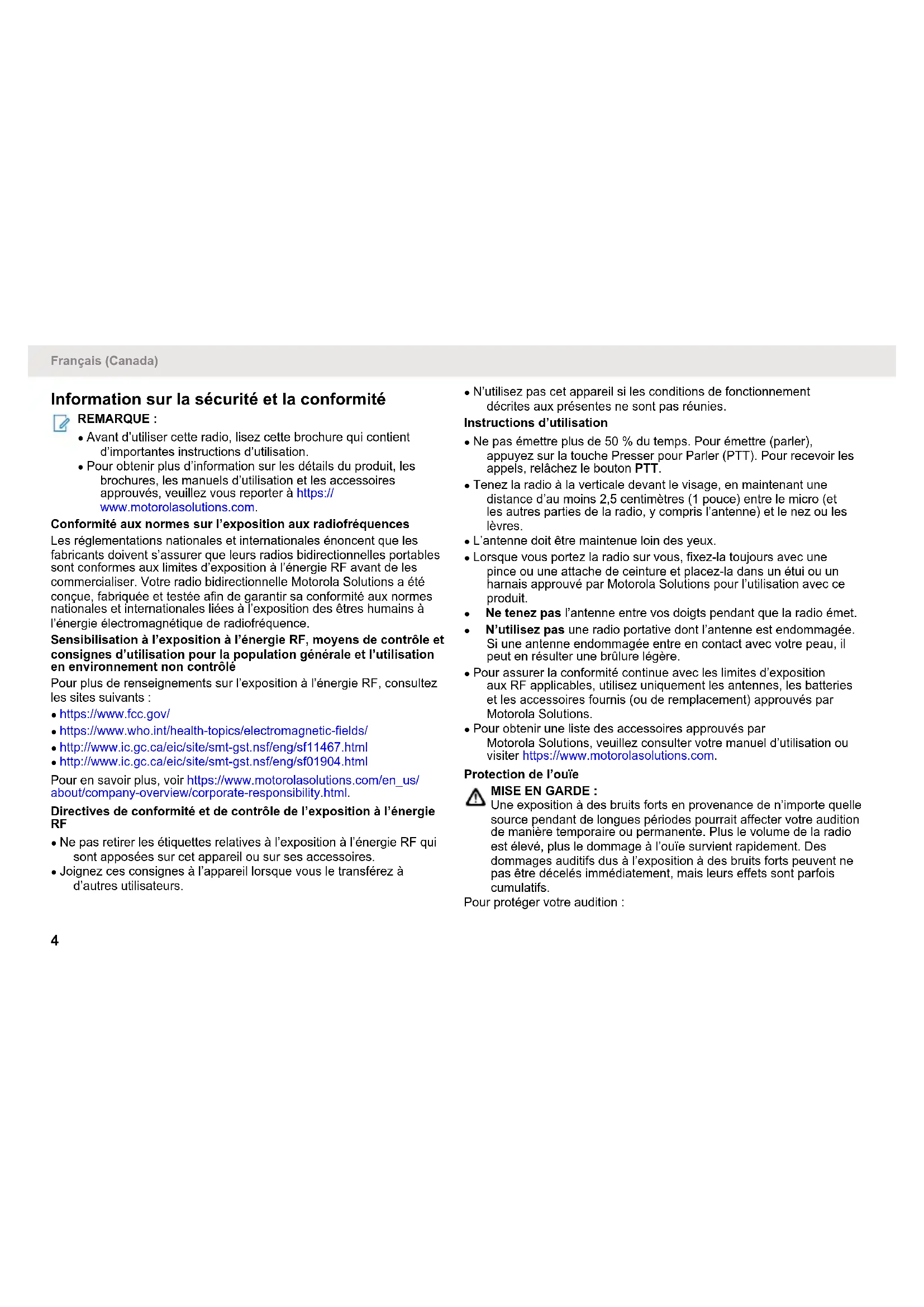- Garantie Français (Canada) 3Information sur la sécurité et la conformité REMARQUE : ● Avant d’utiliser cette radio, lisez cette brochure qui contient d’importantes instructions d’utilisation. ● Pour obtenir plus d’information sur les détails du produit, les brochures, les manuels d’utilisation et les accessoires approuvés, veuillez vous reporter à https:// www.motorolasolutions.com. Conformité aux normes sur l’exposition aux radiofréquences Les réglementations nationales et internationales énoncent que les fabricants doivent s’assurer que leurs radios bidirectionnelles portables sont conformes aux limites d’exposition à l’énergie RF avant de les commercialiser. Votre radio bidirectionnelle Motorola Solutions a été conçue, fabriquée et testée afin de garantir sa conformité aux normes nationales et internationales liées à l’exposition des êtres humains à l’énergie électromagnétique de radiofréquence. Sensibilisation à l’exposition à l’énergie RF, moyens de contrôle et consignes d’utilisation pour la population générale et l’utilisation en environnement non contrôlé Pour plus de renseignements sur l’exposition à l’énergie RF, consultez les sites suivants : ● https://www.fcc.gov/ ● https://www.who.int/health-topics/electromagnetic-fields/ ● http://www.ic.gc.ca/eic/site/smt-gst.nsf/eng/sf11467.html ● http://www.ic.gc.ca/eic/site/smt-gst.nsf/eng/sf01904.html Pour en savoir plus, voir https://www.motorolasolutions.com/en_us/ about/company-overview/corporate-responsibility.html. Directives de conformité et de contrôle de l’exposition à l’énergie p. 24