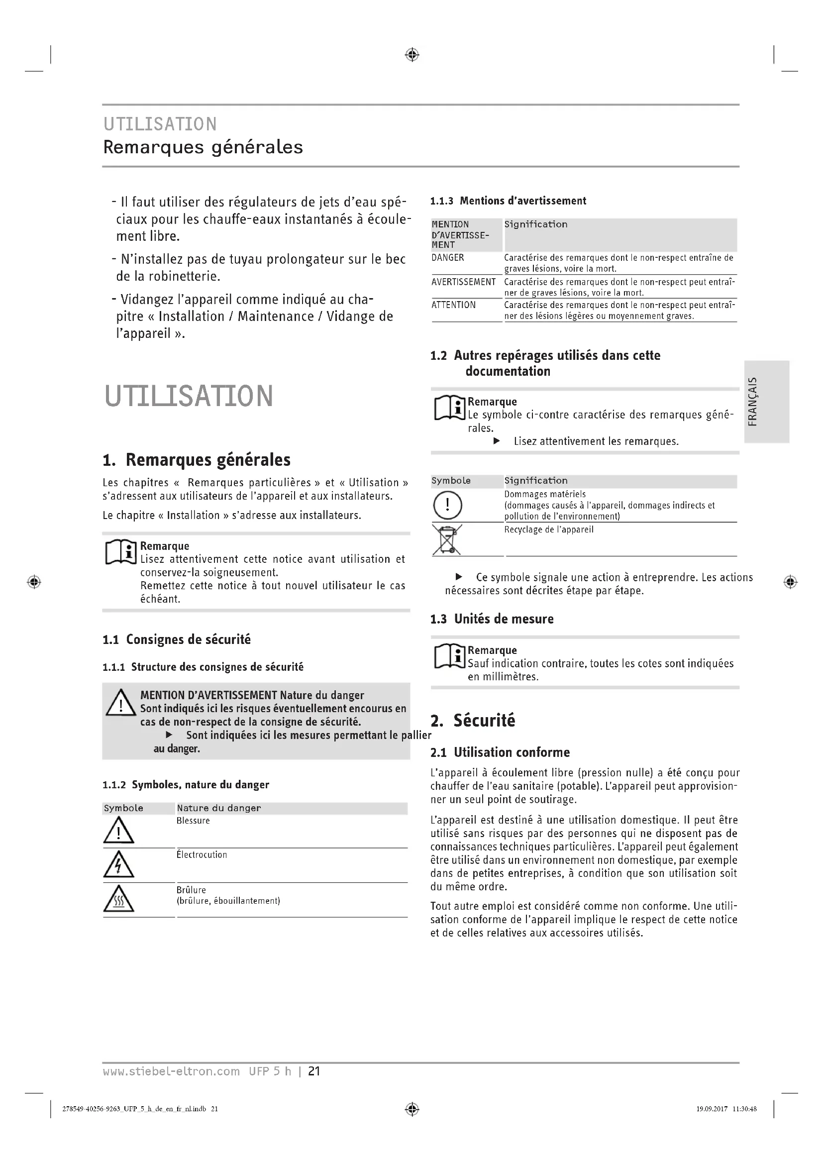 278549-40256-9263_UFP_5_h_de_en_fr_nl.indb 20 19.09.2017 11:30:48UTILISATION Remarques générales www.stiebel-eltron.com UFP 5 h | 21 FRANÇAIS - Il faut utiliser des régulateurs de jets d’eau spé-ciaux pour les chauffe-eaux instantanés à écoule-ment libre. - N’installez pas de tuyau prolongateur sur le bec de la robinetterie. - Vidangez l’appareil comme indiqué au cha-pitre «Installation/ Maintenance/ Vidange de l’appareil». UTILISATION