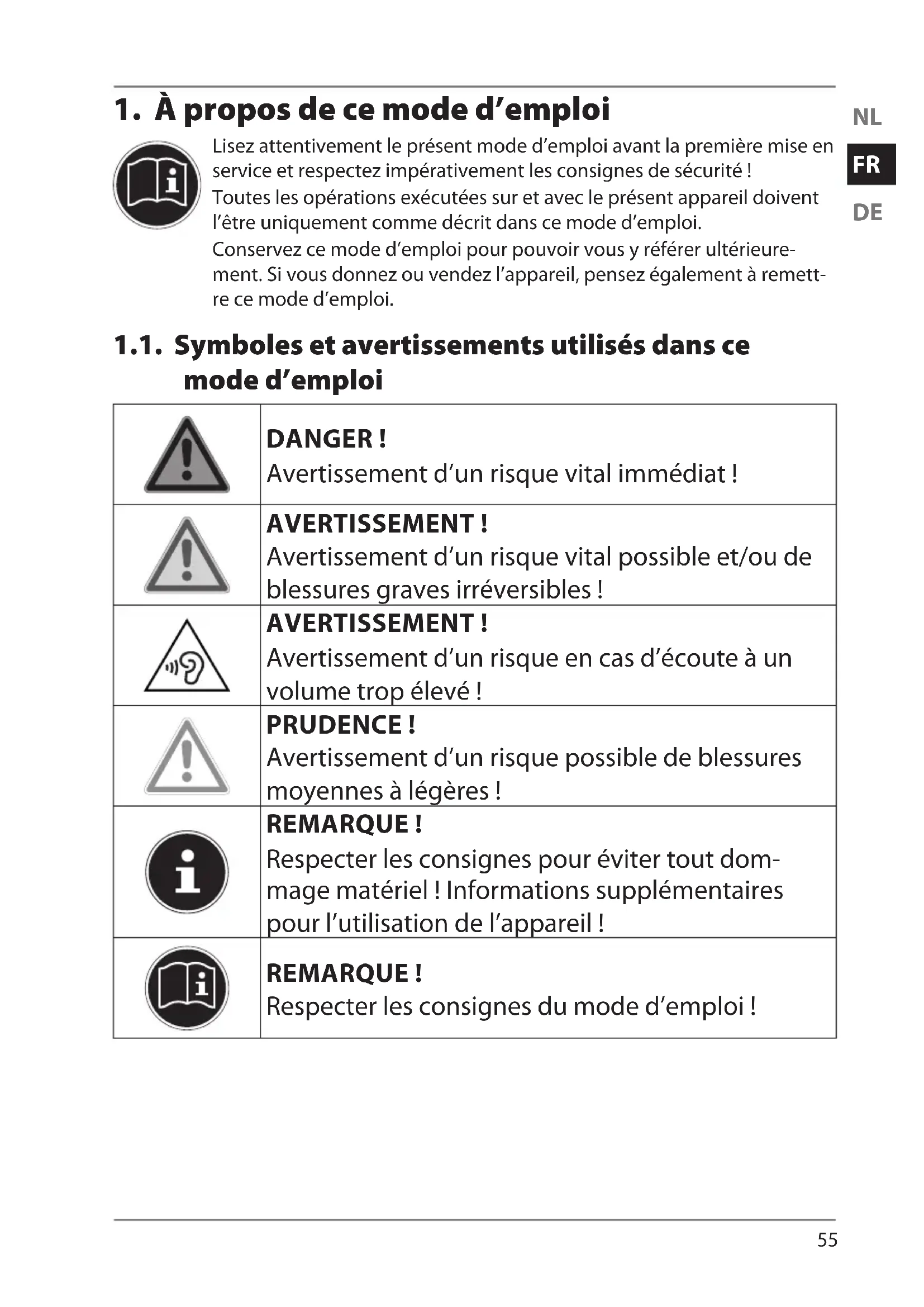 Lisez attentivement le présent mode d’emploi avant la première mise en service et respectez impérativement les consignes de sécurité ! Toutes les opérations exécutées sur et avec le présent appareil doivent l’être uniquement comme décrit dans ce mode d’emploi. Conservez ce mode d’emploi pour pouvoir vous y référer ultérieure- ment. Si vous donnez ou vendez l’appareil, pensez également à remett- re ce mode d’emploi. 1.1. Symboles et avertissements utilisés dans ce mode d’emploi DANGER! Avertissement d’un risque vital immédiat ! AVERTISSEMENT! Avertissement d’un risque vital possible et/ou de blessures graves irréversibles ! AVERTISSEMENT! Avertissement d’un risque en cas d’écoute à un volume trop élevé ! PRUDENCE! Avertissement d’un risque possible de blessures moyennes à légères ! REMARQUE! Respecter les consignes pour éviter tout dom- mage matériel ! Informations supplémentaires pour l’utilisation de l’appareil ! REMARQUE! Respecter les consignes du mode d’emploi ! 99850 E6424 D15 FR ALDI BE_LUX Content MSN 4005 8294 final.indb 5599850 E6424 D15 FR ALDI BE_LUX Content MSN 4005 8294 final.indb 55 08.03.2016 10:33:5008.03.2016 10:33:5056 1.2. Utilisation conforme Cet appareil est destiné à l’utilisation, la gestion et le traitement de documents et contenus multimédia électroniques ainsi qu’à la communication numérique. L’appa- reil est prévu uniquement pour une utilisation privée et non industrielle/commerciale. Veuillez noter qu’en cas d’utilisation non conforme, la garantie est annulée :