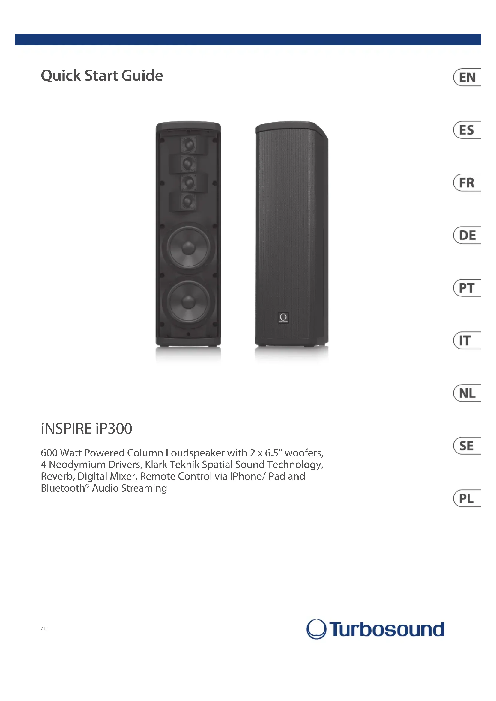 *independent of limiters and driver protection circuits50 iNSPIRE iP300 Quick Start Guide 51 CaractéristiquesEspecicaciones Système Fréquence de réponse 50 Hz - 20 kHz ± 3 dB 40 Hz - 20 kHz -10 dB Dispersion nominale 120° H à -6 dB points SPL maximum 122 dB Type de croisement 2 voies, active Transducteurs Haut-parleur LF 2 x 6,5"(167 mm) Haut-parleur HF 4 x 2" (54,2 mm ) Limiteur Fréquence haute, moyenne et basse indépendante Amplificateur Puissance de sortie maximale* 600 W Taper LF: Classe-D HF: Classe AB protection Court-circuit, circuit ouvert, thermique Canaux d’amplificateur 2 Connectors Entrée A / B 2 x jack combo / XLR Sensibilité 4 dBu, nominal Impédance d’entrée 16 k asymétrique, 32 k symétrique Niveau d’entrée maximum +22 dBu Sortie de lien XLR Alimentation secteur Connecteur secteur IEC avec interrupteur d’alimentation intégré† Les contrôles Matériel Encodeur rotatif Logiciel Interface iOS / Android via Bluetooth DSP Préréglages d’égalisation d’usine Positionnement, mode sonore Affichage LCD 128 x 32, bleu, rétroéclairé Niveau Principale Égalisation Basses, médiums et aigus protection Fonction de verrouillage pour tous les paramètres Mélangeur d’entrée Égalisation Basses et aigus Réverbération Conception Klark Teknik Technologie sans fil Bluetooth Gamme de fréquences 2402 MHz à 2480 MHz Le numéro de canal 79 Version Bluetooth 4.1 double mode Production 8 dBM Compatibilité Prend en charge le prol GATT / A2DP 1.2 Portée de communication maximale 30 m typique Connectivité Maître-esclave: lien d’appairage stéréo Source de courant Consommation d’énergie 80 W à ⁄ de puissance max Tension (fusibles) États-Unis / Canada / Japon 100 à 120 V ~, 50/60 Hz (T 6,3 AH 250 V) Royaume-Uni / Australie / Europe 220 à 240 V ~, 50/60 Hz (T 3,15 AH 250 V) Corée / Chine 220 à 240 V ~, 50/60 Hz (T 3,15 AH 250 V) Enceinte Dimensions (H x L x P) 713 x 208 x 216 mm (28,1 x 8,2 x 8,5") Poids net 11,9 kg (26,2 livres) Construction Plastique technique (GXPP) Finir Peinture noire semi-mate Grille Acier perforé enduit de poudre Accessoires