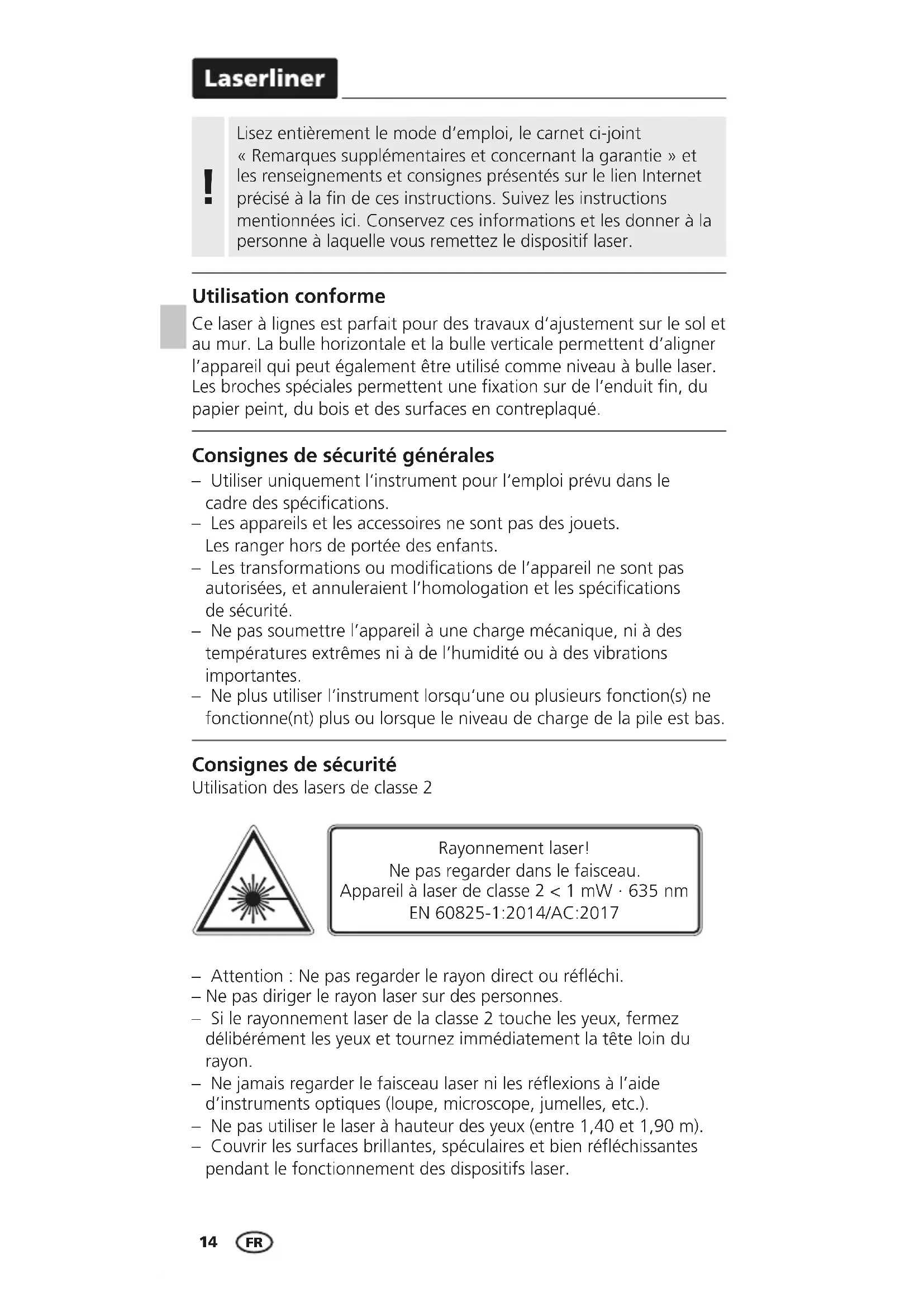Utilisation conforme Ce laser à lignes est parfait pour des travaux d’ajustement sur le sol et au mur. La bulle horizontale et la bulle verticale permettent d’aligner l’appareil qui peut également être utilisé comme niveau à bulle laser. Les broches spéciales permettent une fixation sur de l’enduit fin, du papier peint, du bois et des surfaces en contreplaqué. Consignes de sécurité générales – Utiliser uniquement l‘instrument pour l‘emploi prévu dans le cadre des spécications. – Les appareils et les accessoires ne sont pas des jouets. Les ranger hors de portée des enfants. – Les transformations ou modications de l’appareil ne sont pas autorisées, et annuleraient l’homologation et les spécications de sécurité. – Ne pas soumettre l’appareil à une charge mécanique, ni à des températures extrêmes ni à de l’humidité ou à des vibrations importantes. – Ne plus utiliser l‘instrument lorsqu‘une ou plusieurs fonction(s) ne fonctionne(nt) plus ou lorsque le niveau de charge de la pile est bas. – Attention : Ne pas regarder le rayon direct ou rééchi. – Ne pas diriger le rayon laser sur des personnes. – Si le rayonnement laser de la classe 2 touche les yeux, fermez délibérément les yeux et tournez immédiatement la tête loin du rayon. – Ne jamais regarder le faisceau laser ni les réexions à l’aide d’instruments optiques (loupe, microscope, jumelles, etc.). – Ne pas utiliser le laser à hauteur des yeux (entre 1,40 et 1,90 m). – Couvrir les surfaces brillantes, spéculaires et bien rééchissantes pendant le fonctionnement des dispositifs laser. Consignes de sécurité Utilisation des lasers de classe 2 Rayonnement laser! Ne pas regarder dans le faisceau. Appareil à laser de classe 2 < 1 mW · 635 nm EN 60825-1:2014/AC:2017LaserCube