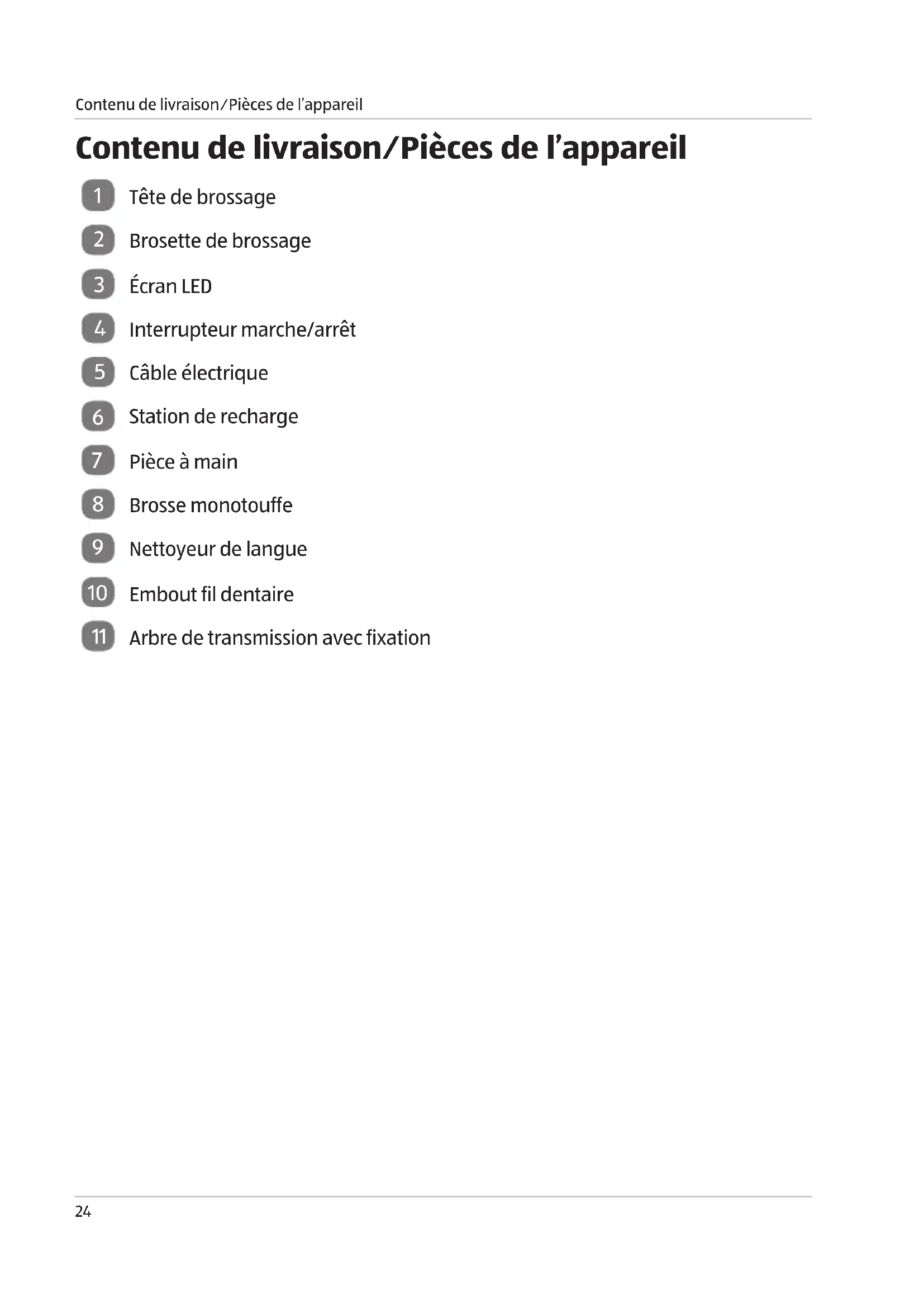 − Les enfants doivent être surveillés pour s’assurer qu’ils ne jouent pas avec la brosse à dents. − Tenez les enfants de moins de huit ans éloignés de la brosse à dents et de son câble d’alimentation. − Ne laissez pas les enfants jouer avec le film d’emballage. Les enfants peuvent s’y emmêler et s’étouffer en jouant avec celui-ci. AVERTISSEMENT! Risque d’explosion! Les accus peuvent exploser s’ils sont fortement chauffés. − Ne chauffez pas les accus et ne les jetez pas dans un feu ouvert. ATTENTION! Risque de blessure! Une utilisation non conforme de la brosse à dents peut provoquer des blessures. − Placez le câble électrique de façon à ce qu’il ne devienne pas un piège à trébucher. − Remplacez immédiatement les brossettes usées ou endom- magées pour éviter les blessures buccales et dentaires. − Tenez compte des conseils pour le brossage des dents. AVIS! Risque d’endommagement! Un maniement inapproprié de la brosse à dents peut l’endommager. − Ne laissez pas tomber la pièce à main. Si cela devait se pro- duire, n’utilisez plus la brosse à dents. Faites-la vérifier par un centre de service autorisé. − Pour changer une brossette, éteignez la brosse à dents.Préparation