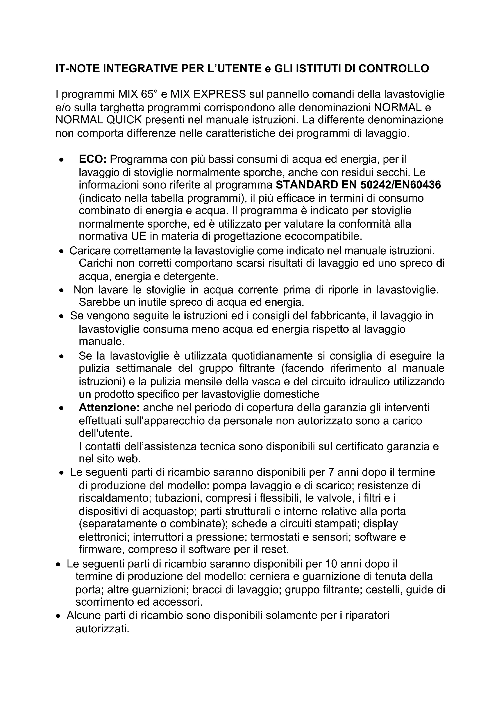 Les programmes MIX 65° et MIX EXPRESS sur le panneau de commande du lave-vaisselle et/ou sur la plaque des programmes correspondent aux appellations NORMAL et NORMAL QUICK présentes dans le mode d’emploi. L’appellation différente ne comporte pas de différences dans les caractéristiques des programmes de lavage. ECO : Programme à faible consommation d'eau et d'énergie, pour le lavage de vaisselle avec un encrassement normal, même avec des résidus secs. Les informations font référence au programme STANDARD EN 50242/EN60436 (indiqué dans le tableau des programmes), le plus efficace en termes de consommation combinée d’énergie et d'eau. Le programme est indiqué pour de la vaisselle avec un encrassement normal, et est utilisé pour évaluer la conformité à la réglementation UE en matière de conception écologique. Chargez correctement le lave-vaisselle comme indiqué dans le mode d’emploi. Des chargements incorrects comportent des résultats de lavage médiocres et un gaspillage d'eau, d’énergie et de détergent. Ne lavez pas la vaisselle avec de l'eau courante avant de la mettre dans le lave-vaisselle. Ce serait un gaspillage d'eau et d’énergie inutile. Si vous suivez les instructions et les conseils du fabriquant, le lavage au lave-vaisselle consommera moins d’eau et d’énergie par rapport au lavage manuel. Si le lave-vaisselle est utilisé quotidiennement, nous recommandons d’effectuer le lavage hebdomadaire du groupe de filtration (en faisant référence au mode d’emploi) et le nettoyage mensuel de la cuve et du circuit hydraulique en utilisant un produit spécifique pour lave-vaisselles domestiques Attention : même pendant la période de garantie, les interventions effectuées sur l’appareil par du personnel non autorisé sont à la charge de l’utilisateur. Les contacts du service après-vente sont disponibles sur le certificat de garantie et sur le site Internet. Les pièces de rechange suivantes seront disponibles pendant 7 ans après la fin de production du modèle : la pompe de lavage et de vidange, les résistances de chauffage, les tubages, y compris les tuyaux, les vannes, les filtres et les dispositifs d’acquastop, les parties structurelles et internes relatives à la porte (séparément et combinées), les cartes à circuits imprimés, les écrans électroniques, les interrupteurs à pression, les thermostats et les capteurs, les logiciels et les micrologiciels, y compris le logiciel pour le rétablissement. Les pièces de rechange suivantes seront disponibles pendant 10 ans après la fin de production du modèle : les charnières et les joints d’étanchéité de la porte, les autres joints, les bras de lavage, le groupe de filtration, les paniers, les voies de guidage et les accessoires. Certaines pièces de rechange ne sont disponibles que pour les réparateurs autorisés. Toutes les pièces de rechange ne concernent pas tous les modèles. La base de données EPREL de l’UE fournit des informations relatives aux performances du lave-vaisselle. La base de données peut être consultée de manière directe grâce au code QR présent sur l’étiquette énergétique du lave-vaisselle ou en utilisant le lien https://eprel.ec.europa.eu. Dans ce cas, il faudra saisir le nom du modèle présent sur la plaque des caractéristiques, appliquée sur le côté de la porte. Pour des informations détaillées sur l’étiquette énergétique : www.theenergylabel.eu.