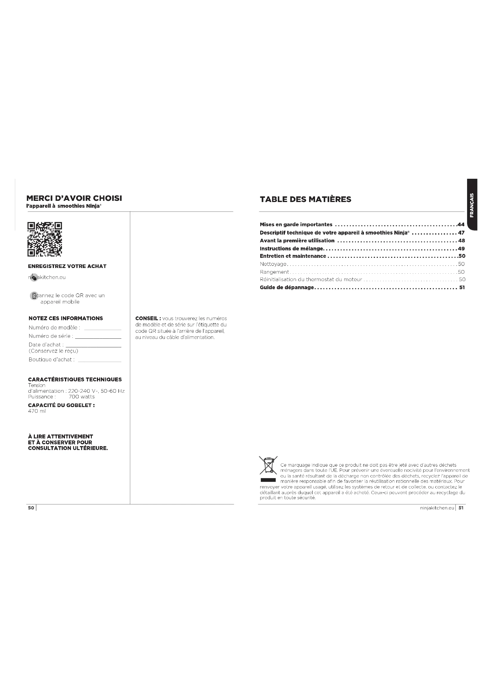 l’appareil à smoothies Ninja® Ce marquage indique que ce produit ne doit pas être jeté avec d’autres déchets ménagers dans toute l’UE. Pour prévenir une éventuelle nocivité pour l’environnement ou la santé résultant de la décharge non contrôlée des déchets, recyclez l’appareil de manière responsable afin de favoriser la réutilisation rationnelle des matériaux. Pour renvoyer votre appareil usagé, utilisez les systèmes de retour et de collecte, ou contactez le détaillant auprès duquel cet appareil a été acheté. Ceux-ci peuvent procéder au recyclage du produit en toute sécurité.52 53 ninjakitchen.eu FRANÇAIS Veuillez lire attentivement toutes les instructions avant d’utiliser votre