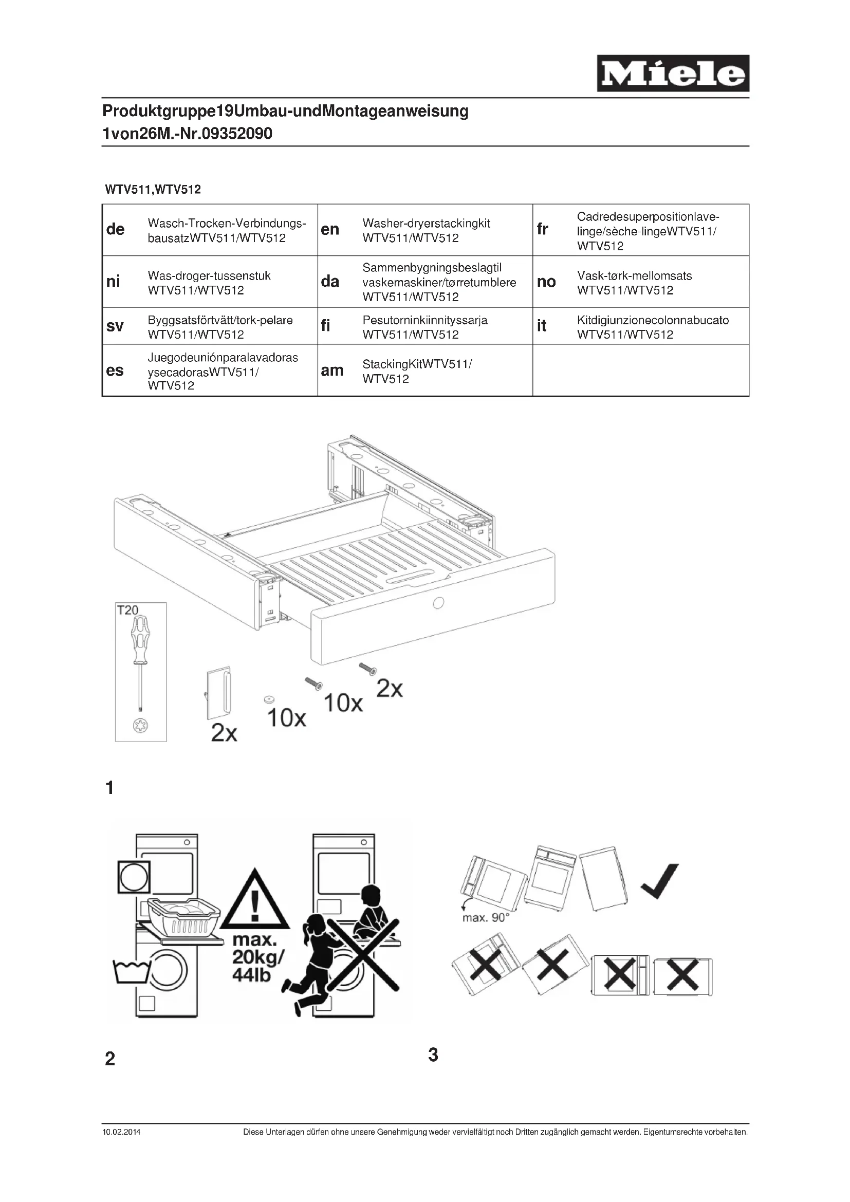 Attention ! Transporter le sèche-linge à pompe à chaleur comme décrit dans croquis 3. Si le sèche-linge n'a pas été transporté conformément à cette description, prévoir une heure de temps de repos avant de le raccorder au courant. La pompe à chaleur pourrait sinon être endommagée. Remarque La plaque de carton présente dans le tiroir sert à la fois de sécurité de transport et d'aide de montage. Enlever la plaque de carton après le montage seulement ! A Dévisser les pieds du sèche-linge et les régler (croquis 4). A Retourner le cadre avec le tiroir inséré (croquis 5). A Coller les bagues d'étanchéité (croquis 6). Produktgruppe 19 Umbau- und Montageanweisung 14 von 26 M.-Nr. 09352090 10.02.2014 Diese Unterlagen dürfen ohne unsere Genehmigung weder vervielfältigt noch Dritten zugänglich gemacht werden. Eigentumsrechte vorbehalten.A Retourner le cadre et le déposer sur le lave-linge en le centrant bien (croquis 7). A Aligner la façade du cadre sur le bandeau du lave-linge (croquis 8). A Visser le cadre prudemment avec une visseuse portative sur le couvercle du lave-linge. Ne pas serrer excessivement les vis. (croquis 9, pos. A: A Sortir la plaque de carton du tiroir (croquis 9, pos. B). A Déverrouiller le tiroir en le pressant et l'enlever (croquis 10). A Presser les fermetures à ressort et retirer en même temps le tiroir vers le haut (croquis 11). A Disposer le sèche-linge sur le cadre et faire glisser les pieds du sèche-linge à l'arrière des logements (croquis 12, pos. A et croquis 13, pos. A). A Disposer les pieds du sèche-linge dans les supports (croquis 12, pos. B et croquis 13, pos. B). A Fixer les bandeaux (croquis 14, pos. 1, pos. 2). A Mettre le tiroir en place : A Poser le tiroir sur les glissières et fermer le tiroir. Le tiroir s'enclenche avec un déclic. A Pour s'assurer que le tiroir s'enclenche bien dans les glissières, ouvrir le tiroir et le fermer avec force.