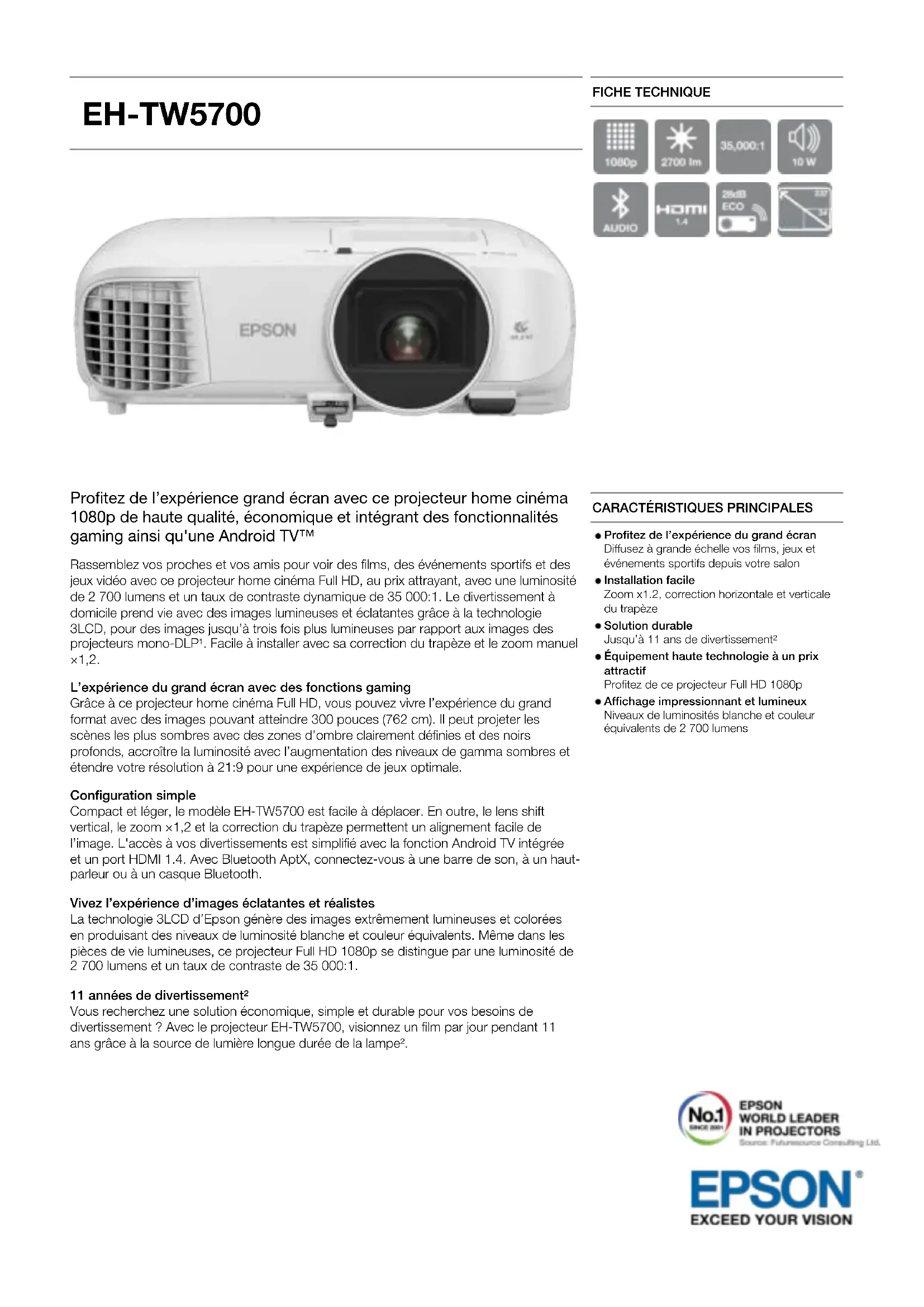 EH-TW5700 FICHE TECHNIQUE Profitez de l’expérience grand écran avec ce projecteur home cinéma 1080p de haute qualité, économique et intégrant des fonctionnalités gaming ainsi qu'une Android TV™ Rassemblez vos proches et vos amis pour voir des films, des événements sportifs et des jeux vidéo avec ce projecteur home cinéma Full HD, au prix attrayant, avec une luminosité de 2 700 lumens et un taux de contraste dynamique de 35 000:1. Le divertissement à domicile prend vie avec des images lumineuses et éclatantes grâce à la technologie 3LCD, pour des images jusqu’à trois fois plus lumineuses par rapport aux images des projecteurs mono-DLP¹. Facile à installer avec sa correction du trapèze et le zoom manuel ×1,2. L’expérience du grand écran avec des fonctions gaming Grâce à ce projecteur home cinéma Full HD, vous pouvez vivre l’expérience du grand format avec des images pouvant atteindre 300 pouces (762 cm). Il peut projeter les scènes les plus sombres avec des zones d’ombre clairement définies et des noirs profonds, accroître la luminosité avec l’augmentation des niveaux de gamma sombres et étendre votre résolution à 21:9 pour une expérience de jeux optimale. Configuration simple Compact et léger, le modèle EH-TW5700 est facile à déplacer. En outre, le lens shift vertical, le zoom ×1,2 et la correction du trapèze permettent un alignement facile de l’image. L'accès à vos divertissements est simplifié avec la fonction Android TV intégrée et un port HDMI 1.4. Avec Bluetooth AptX, connectez-vous à une barre de son, à un haut- parleur ou à un casque Bluetooth. Vivez l’expérience d’images éclatantes et réalistes La technologie 3LCD d’Epson génère des images extrêmement lumineuses et colorées en produisant des niveaux de luminosité blanche et couleur équivalents. Même dans les pièces de vie lumineuses, ce projecteur Full HD 1080p se distingue par une luminosité de 2 700 lumens et un taux de contraste de 35 000:1. 11 années de divertissement² Vous recherchez une solution économique, simple et durable pour vos besoins de divertissement ? Avec le projecteur EH-TW5700, visionnez un film par jour pendant 11 ans grâce à la source de lumière longue durée de la lampe².