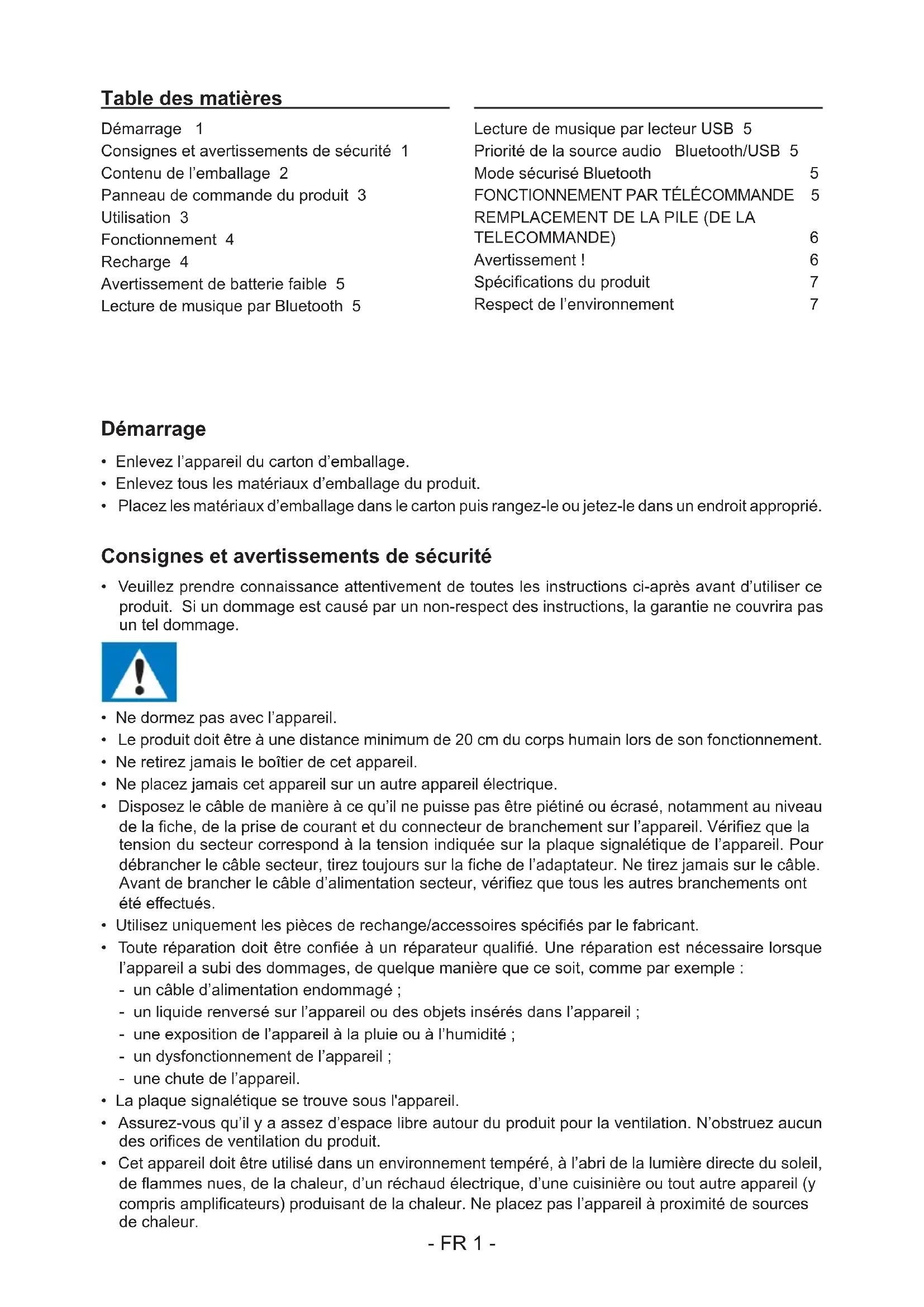 - Cet appareil doit être utilisé dans un environnement tempéré, à l’abri de la lumière directe du soleil, GHÀDPPHVQXHVGHODFKDOHXUG¶XQUpFKDXGpOHFWULTXHG¶XQHFXLVLQLqUHRXWRXWDXWUHDSSDUHLO\ FRPSULVDPSOL¿FDWHXUVSURGXLVDQWGHODFKDOHXU1HSODFH]SDVO¶DSSDUHLOjSUR[LPLWpGHVRXUFHV de chaleur. Démarrage 1 Consignes et avertissements de sécurité 1 Contenu de l’emballage 2 Panneau de commande du produit 3 Utilisation 3 Fonctionnement 4 Recharge 4 Avertissement de batterie faible 5 Lecture de musique par Bluetooth 5 Lecture de musique par lecteur USB 5 Priorité de la source audio : Bluetooth/USB 5 Mode sécurisé Bluetooth 5