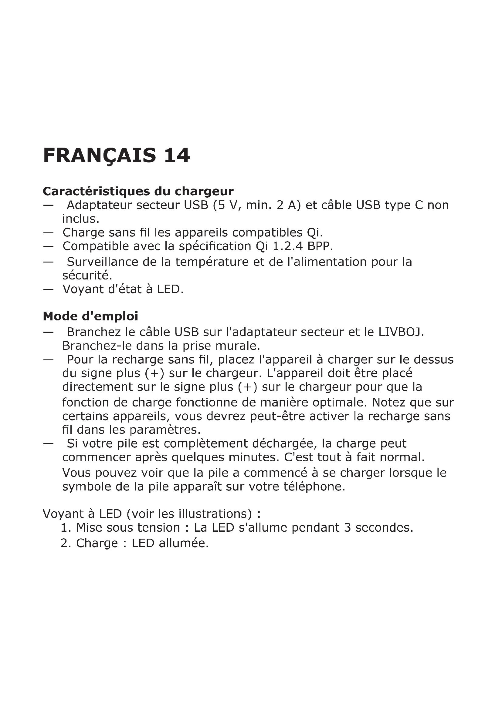 — Ne chargez que des appareils compatibles Qi. — La prise murale doit être située à proximité de l'équipement et être facilement accessible. — N'utilisez que dans des endroits secs. — Surveillez toujours les enfants pour vous assurer qu'ils ne jouent pas avec le produit. — N'utilisez jamais un câble USB défectueux ou endommagé pour la charge car cela peut endommager le dispositif et nuire à votre appareil.