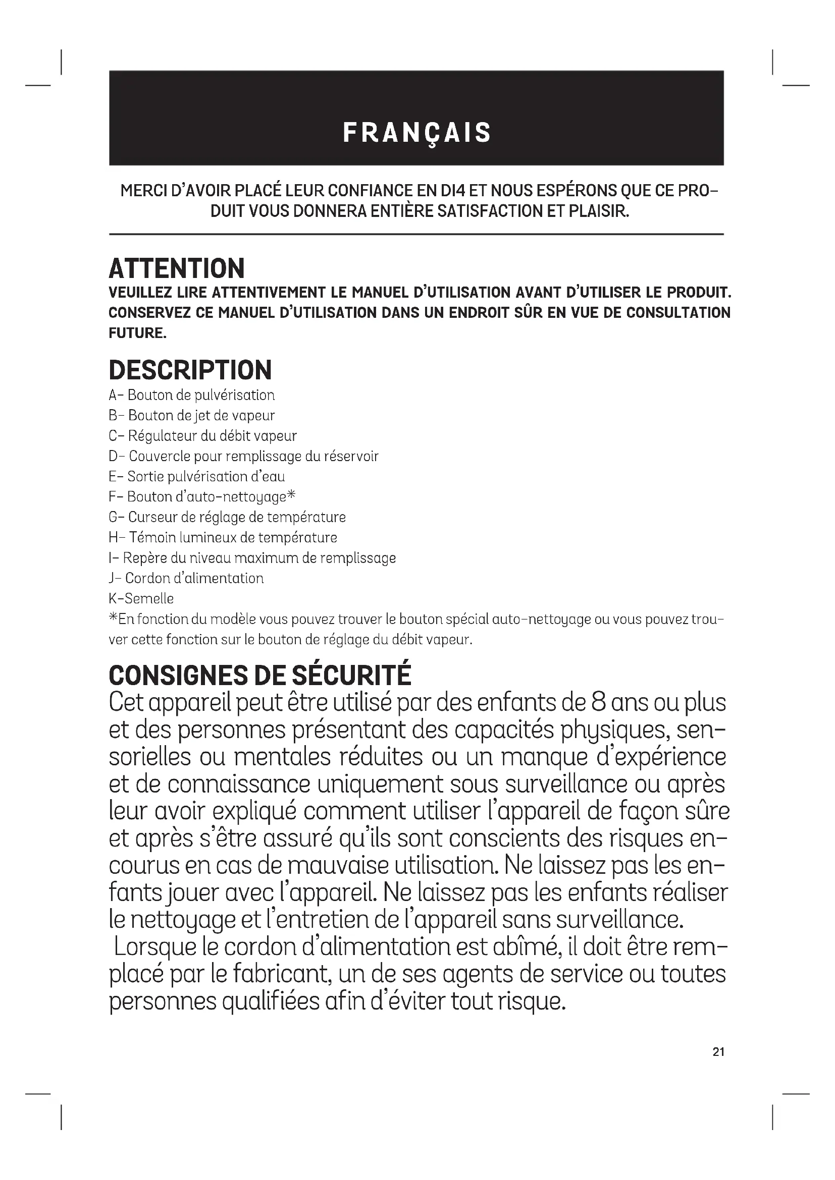 Ce produit est conforme à la Directive Européenne 2012/19/UE relative aux déchets d’équipements électriques et électroniques (DEEE) qui fournit le cadre légal applicable dans l’Union Européenne pour l’élimination et la réutilisation de déchets d’équipements électri- ques et électroniques. Ne jetez pas ce produit à la poubelle, rendez-vous au centre de co- llecte des déchets d’équipements électriques et électroniques le plus proche de chez vous. Nous espérons que ce produit vous donnera entière satisfaction.27 GRAZIE PER AVER RIPOSTO LA LORO FIDUCIA IN DI4 E LA SPERANZA CHE IL PRODOT- TO SODDISFI APPIENO LE VOSTRE ASPETTATIVE. AVVERTENZE PRIMA DI UTILIZZARE IL PRODOTTO, LEGGERE ATTENTAMENTE LE ISTRUZIONI D’USO. CON- SERVARE LE ISTRUZIONI IN LUOGO SICURO PER CONSULTAZIONI FUTURE. DESCRIPTION A- Tasto spray B- Tasto getto di vapore C- Regolazione vapore D- Sportello per ingresso riempimento E- Beccuccio uscita spray F- Tasto Autopulizia* G-Termostato Temperatura H- Spia luminosa temperatura I- Indicatore livello massimo di riempimento J- Cavo di alimentazione K- Piastra *A seconda del modello, è presente il tasto speciale di Autopulizia; in alternativa, la funzione è inte- grata in quella di controllo vapore.