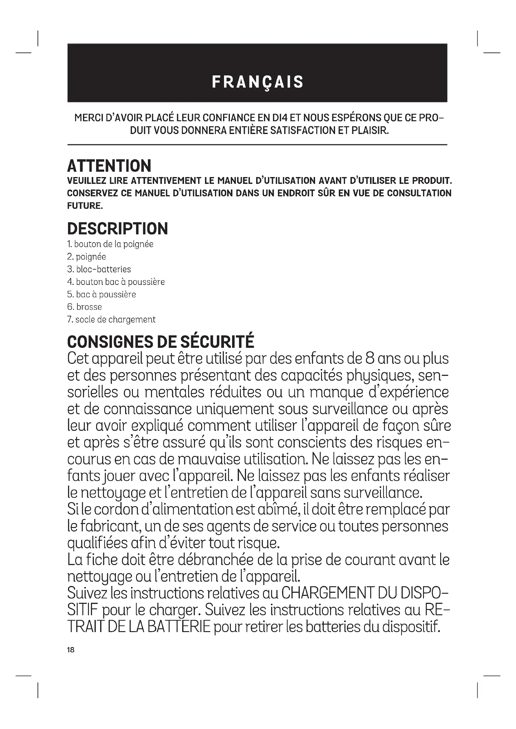 Ce produit est conforme à la Directive Européenne 2012/19/UE relative aux déchets d’équipements électriques et électroniques (DEEE) qui fournit le cadre légal applicable dans l’Union Européenne pour l’élimination et la réutilisation de déchets d’équipements électri- ques et électroniques. Ne jetez pas ce produit à la poubelle, rendez-vous au centre de co- llecte des déchets d’équipements électriques et électroniques le plus proche de chez vous. Le produit peut contenir des batteries. Retirez-les avant d’éliminer le produit et jetez-les dans des conteneurs spéciaux approuvés à cet effet.23 GRAZIE PER AVER RIPOSTO LA LORO FIDUCIA IN DI4 E LA SPERANZA CHE IL PRODOT- TO SODDISFI APPIENO LE VOSTRE ASPETTATIVE. AVVERTENZE PRIMA DI UTILIZZARE IL PRODOTTO, LEGGERE ATTENTAMENTE LE ISTRUZIONI D’USO. CON- SERVARE LE ISTRUZIONI IN LUOGO SICURO PER CONSULTAZIONI FUTURE. DESCRIZIONE