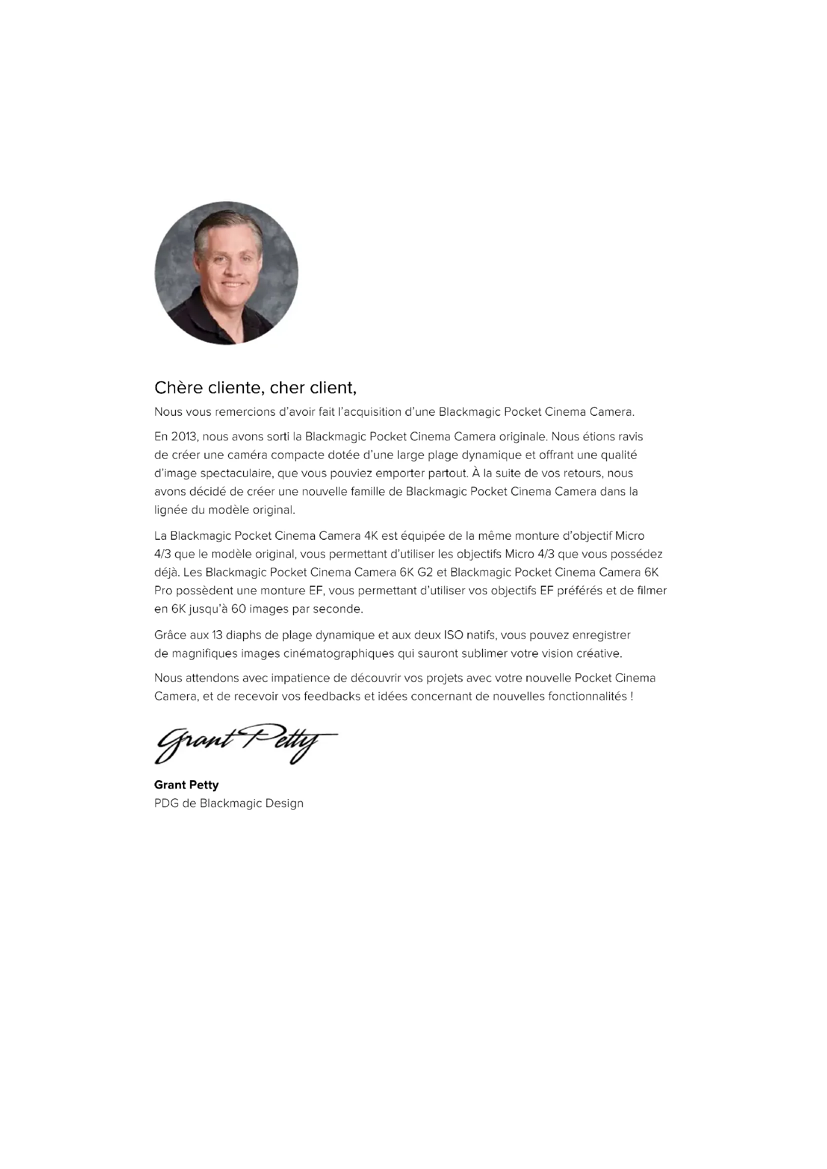 保証Blackmagic Pocket Cinema Camera Blackmagic Pocket Cinema Camera Mai 2022 Manuel d’installation et d’utilisationChère cliente, cher client, Nous vous remercions d’avoir fait l’acquisition d’une Blackmagic Pocket Cinema Camera. En 2013, nous avons sorti la Blackmagic Pocket Cinema Camera originale. Nous étions ravis decréer une caméra compacte dotée d’une large plage dynamique et offrant une qualité d’image spectaculaire, que vous pouviez emporter partout. À la suite de vos retours, nous avons décidé de créer une nouvelle famille de Blackmagic Pocket Cinema Camera dans la lignée du modèle original. La Blackmagic Pocket Cinema Camera 4K est équipée de la même monture d’objectif Micro 4/3 que le modèle original, vous permettant d’utiliser les objectifs Micro 4/3 que vous possédez déjà. Les Blackmagic Pocket Cinema Camera 6K G2 et Blackmagic Pocket Cinema Camera 6K Pro possèdent une monture EF, vous permettant d’utiliser vos objectifs EF préférés et de filmer en 6K jusqu’à 60 images par seconde. Grâce aux 13 diaphs de plage dynamique et aux deux ISO natifs, vous pouvez enregistrer demagnifiques images cinématographiques qui sauront sublimer votre vision créative. Nous attendons avec impatience de découvrir vos projets avec votre nouvelle Pocket Cinema Camera, et de recevoir vos feedbacks et idées concernant de nouvelles fonctionnalités ! Grant Petty PDG de Blackmagic DesignQuelle caméra utilisez-vous ? 335 Mise en route 335 Monter un objectif 335 Allumer la caméra 337 Alimenter la caméra avec le câble d’alimentation inclus 337 Supports de stockage 338 Cartes CFast 338 Cartes SD 340 Disques flash USB-C 342 Préparer les supports pour l'enregistrement 343 Préparer un support sur la Blackmagic Pocket Cinema Camera 344 Préparer le support sur Mac 346 Préparer le support sur Windows 346 Enregistrement 348 Enregistrer des clips 348 Blackmagic RAW 349 Enregistrer en Blackmagic RAW 349 Fréquences d'images maximales du capteur 352 Durée d’enregistrement 353 Lecture 359 Caractéristiques de la caméra 359 Face avant de la caméra 359 Face droite 360 Face gauche 361 Face supérieure 363 Face inférieure de la caméra 365 Face arrière de la caméra 366 Commandes de l'écran tactile 369 Paramètres 392 Menu de navigation 392 Onglet Enregistrer 392 Convention de dénomination des fichiers 398 Onglet Moniteur 398 Onglet Audio 405 Onglet Réglages 408 Onglet Préréglages 420 LUTs 3D 423 Saisie des métadonnées 425 Clap 426 Sortie vidéo de la caméra 431 Blackmagic Zoom Demand et Focus Demand 431 Connecter et monter les accessoires sur votre caméra 432 Utiliser le Blackmagic Focus Demand 434 Utiliser le Blackmagic Zoom Demand 434 Utiliser DaVinci Resolve 436 Gestionnaire de projet 436 Monter avec la page Cut 437 Ajouter des clips à la timeline 440 Raccorder des clips dans la timeline 441 Achage Audio trim 441 Ajouter des titres 442 Travailler avec des fichiers Blackmagic RAW 443 Étalonner vos clips avec la page Étalonnage 446 Ajouter une Power Window 449 Utilisation de plug-ins 451 Mixer l’audio 452 Ajouter des VFX et des compositions sur la page Fusion 457 Mastériser votre montage 465 Exportation rapide 465 Page Exportation 466 Contrôle des caméras avec l’ATEM Mini 467 Correcteur colorimétrique primaire DaVinci Resolve 472 Travailler avec un logiciel tiers 475 Travailler avec des fichiers provenant de cartes CFast 2.0 et de cartes SD 475 Travailler avec des fichiers provenant de disques flash USB-C 475 Utiliser Final Cut Pro X 476 Utiliser Avid Media Composer 2018 476 Utiliser Adobe Premiere Pro CC 477 Blackmagic Camera Setup Utility 478 Utiliser une poignée d’alimentation 479 Developer Information 482 Blackmagic Bluetooth Camera Control 482 Blackmagic SDI and Bluetooth Camera Control Protocol 484 Example Protocol Packets 493 Assistance 494 Avis règlementaires 495 Informations de sécurité 496 Garantie 497 Sommaire 334Blackmagic Pocket Cinema CameraQuelle caméra utilisez-vous ? Les modèles Blackmagic Pocket Cinema Camera 6K Pro, 6K G2 et 4K se ressemblent sur plusieurs points. En effet, elles produisent toutes des images d’une qualité exceptionnelle et disposent d’une large plage dynamique, tout en conservant le même boîtier. Les boutons de commande et les menus à l’écran sont similaires et les caméras s’opèrent de la même façon. Cependant, les Blackmagic Pocket Cinema Camera 6K Pro et 6K G2 disposent d’un capteur de taille Super 35mm, d’une monture d’objectif EF, ainsi que d’une icône «6K» sur le côté de la monture. LaBlackmagic Pocket Cinema Camera 4K comprend quant à elle un capteur de taille Micro 4/3, ainsiqu’une monture d’objectif Micro 4/3. Blackmagic Pocket Cinema Camera 6K Pro Blackmagic Pocket Cinema Camera 4K Blackmagic Pocket Cinema Camera 6K G2 Mise en route Pour commencer à utiliser votre caméra, il suffit de monter un objectif et de charger votre caméra. Monter un objectif Les Pocket Cinema Camera 6K G2 et 6K Pro fonctionnent avec des objectifs EF, tandis que la Pocket Cinema Camera 4K utilise des objectifs Micro 4/3. Monter un objectif sur votre caméra se fait de la même façon sur toutes les Pocket Cinema Camera. Commencez par retirer le cache de protection. Pour retirer le cache de protection, maintenez le bouton de verrouillage enfoncé et tournez le cache dans le sens inverse des aiguilles d’une montre jusqu’à ce qu’il soit libéré. 335Mise en routePour monter un objectif EF ou Micro 4/3: 1 Alignez le point situé sur votre objectif avec celui de la monture. De nombreux objectifs possèdent un point bleu, rouge ou blanc ou un autre indicateur. 2 Positionnez la monture d'objectif contre la monture de la caméra et tournez l'objectif dans le sens des aiguilles d'une montre jusqu'à ce qu'il s'emboîte correctement. Monter un objectif Micro 4/3 sur la Blackmagic Pocket Cinema Camera 4K 1 Pour retirer l'objectif, maintenez le bouton de verrouillage enfo