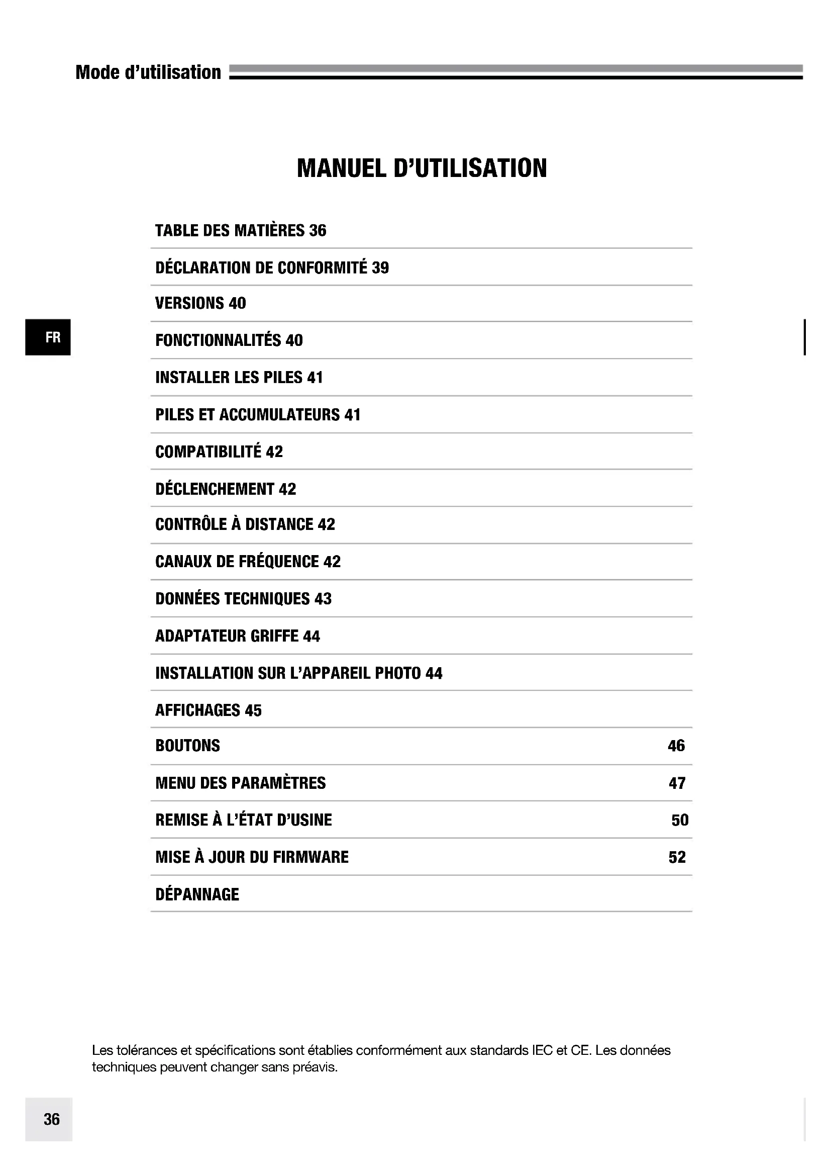 DÉPANNAGE Les tolérances et spécifications sont établies conformément aux standards IEC et CE. Les données techniques peuvent changer sans préavis.37 Mode d’utilisation