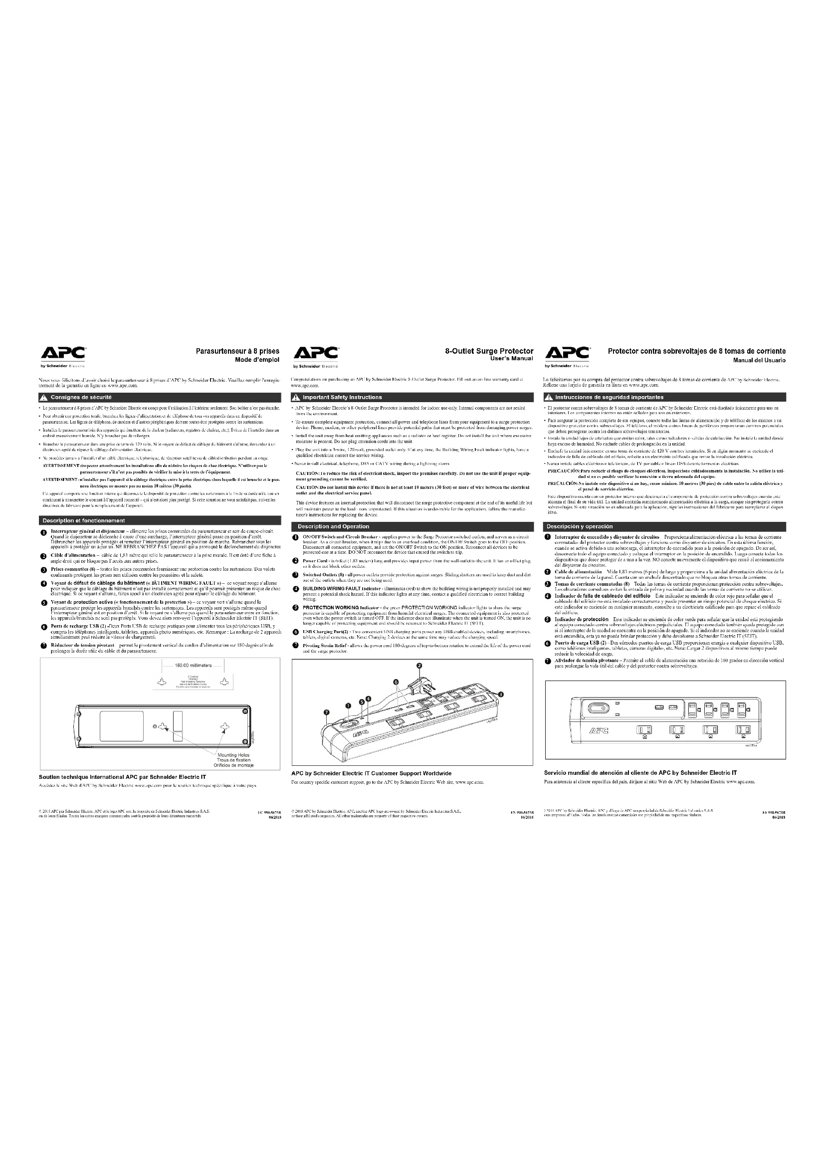 Parasurtenseur à 8 prises Mode d’emploi Nous vous félicitons d’avoir choisi le parasurtenseur à 8 prises d’APC by Schneider Electric. Veuillez remplir l'enregis- trement de la garantie en ligne au www.apc.com.