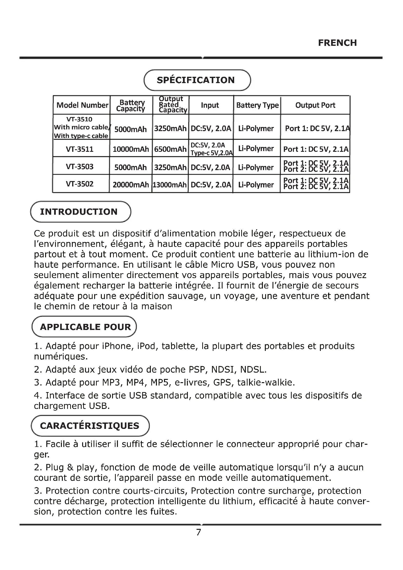 VT3503 - Batterie portable V-TAC - Notice d'utilisation et mode d'emploi gratuit
