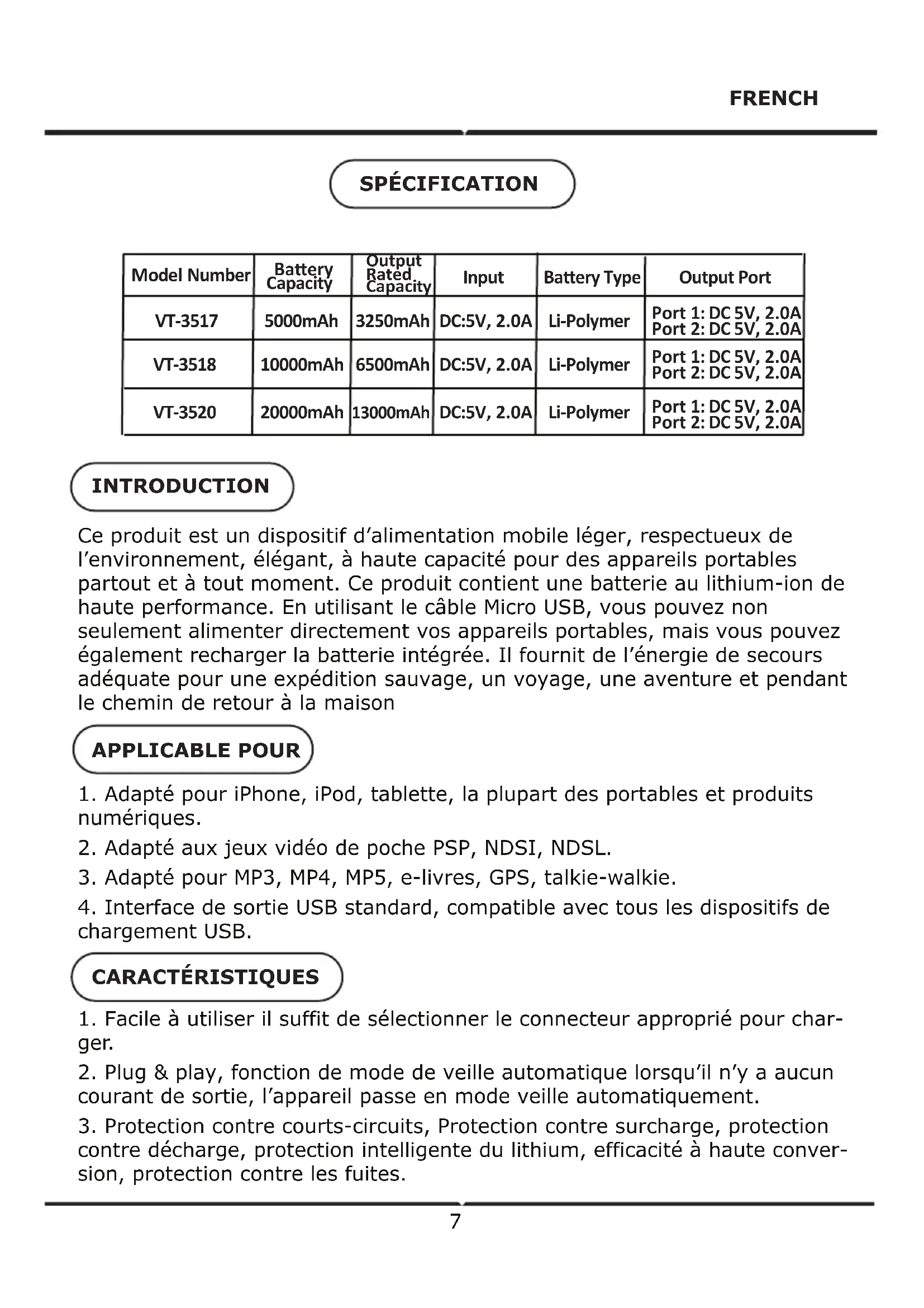 Output Rated Capacity Model Number Input Baery Type Output Port 5000mAh 10000mAh 20000mAh VT-3517 VT-3518 VT-3520 DC:5V, 2.0A DC:5V, 2.0A DC:5V, 2.0A Li-Polymer Li-Polymer Li-Polymer Port 1: DC 5V, 2.0A Port 2: DC 5V, 2.0A Port 1: DC 5V, 2.0A Port 2: DC 5V, 2.0A Port 1: DC 5V, 2.0A Port 2: DC 5V, 2.0A Baery Capacity 3250mAh 6500mAh 13000mAh1. Capacité d’affichage (Nota: applicable pour des modèles avec indicateur LED): Appuyez sur le bouton de contrôle, la capacité LED s’allumera, 10 secondes plus tard il s’éteindra automatiquement. 4 LED allumés: il reste 75 % ~ 100 %. 3 LED allumés: il reste 50 % ~ 75 %. 2 LED allumés: 25 %, il reste 50 %. 1 D LED allumés: moins de 25 %