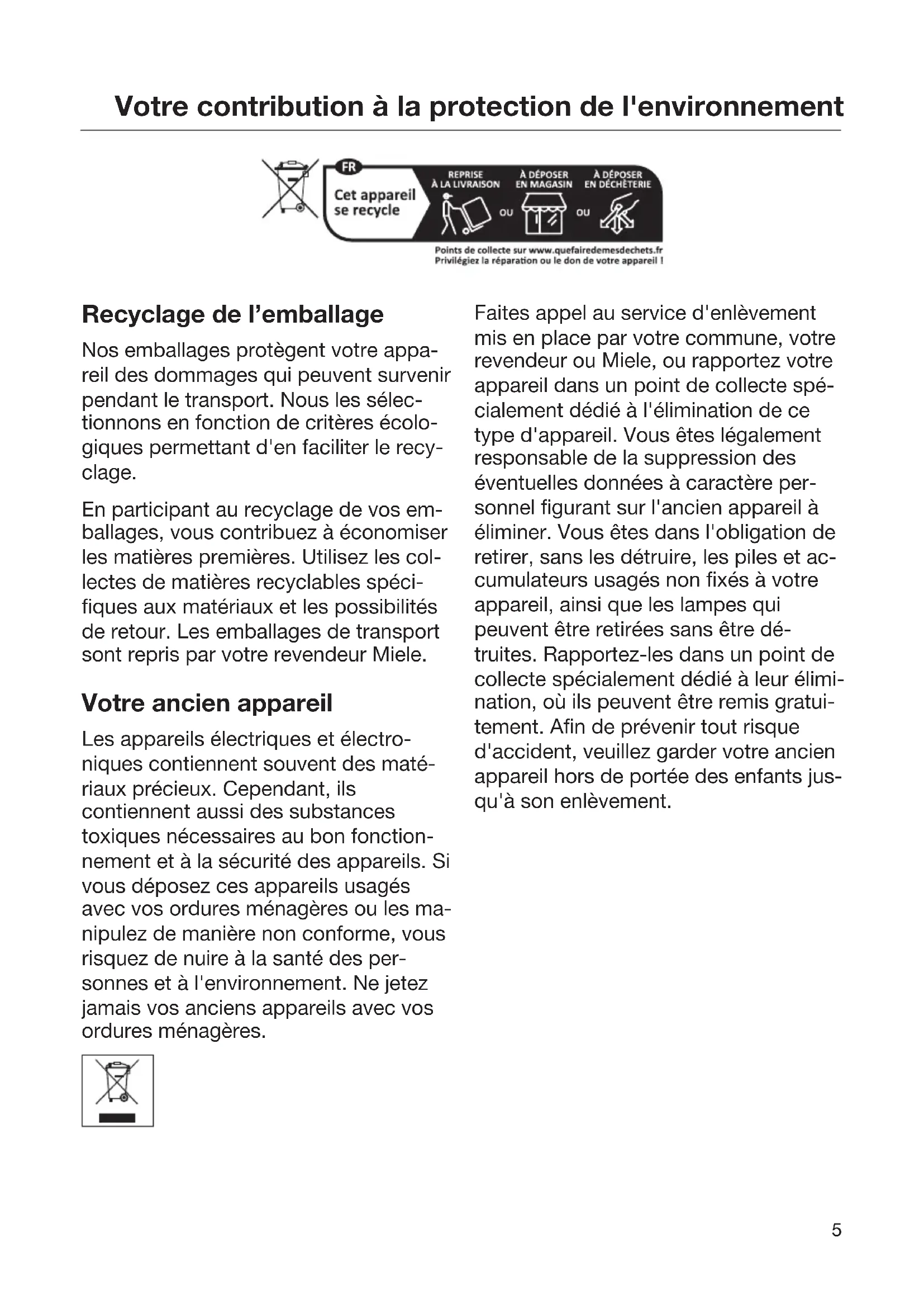 Recyclage de l’emballage Nos emballages protègent votre appa- reil des dommages qui peuvent survenir pendant le transport. Nous les sélec- tionnons en fonction de critères écolo- giques permettant d'en faciliter le recy- clage. En participant au recyclage de vos em- ballages, vous contribuez à économiser les matières premières. Utilisez les col- lectes de matières recyclables spéci- fiques aux matériaux et les possibilités de retour. Les emballages de transport sont repris par votre revendeur Miele. Votre ancien appareil Les appareils électriques et électro- niques contiennent souvent des maté- riaux précieux. Cependant, ils contiennent aussi des substances toxiques nécessaires au bon fonction- nement et à la sécurité des appareils. Si vous déposez ces appareils usagés avec vos ordures ménagères ou les ma- nipulez de manière non conforme, vous risquez de nuire à la santé des per- sonnes et à l'environnement. Ne jetez jamais vos anciens appareils avec vos ordures ménagères. Faites appel au service d'enlèvement mis en place par votre commune, votre revendeur ou Miele, ou rapportez votre appareil dans un point de collecte spé- cialement dédié à l'élimination de ce type d'appareil. Vous êtes légalement responsable de la suppression des éventuelles données à caractère per- sonnel figurant sur l'ancien appareil à éliminer. Vous êtes dans l'obligation de retirer, sans les détruire, les piles et ac- cumulateurs usagés non fixés à votre appareil, ainsi que les lampes qui peuvent être retirées sans être dé- truites. Rapportez-les dans un point de collecte spécialement dédié à leur élimi- nation, où ils peuvent être remis gratui- tement. Afin de prévenir tout risque d'accident, veuillez garder votre ancien appareil hors de portée des enfants jus- qu'à son enlèvement.Consignes de sécurité et mises en garde