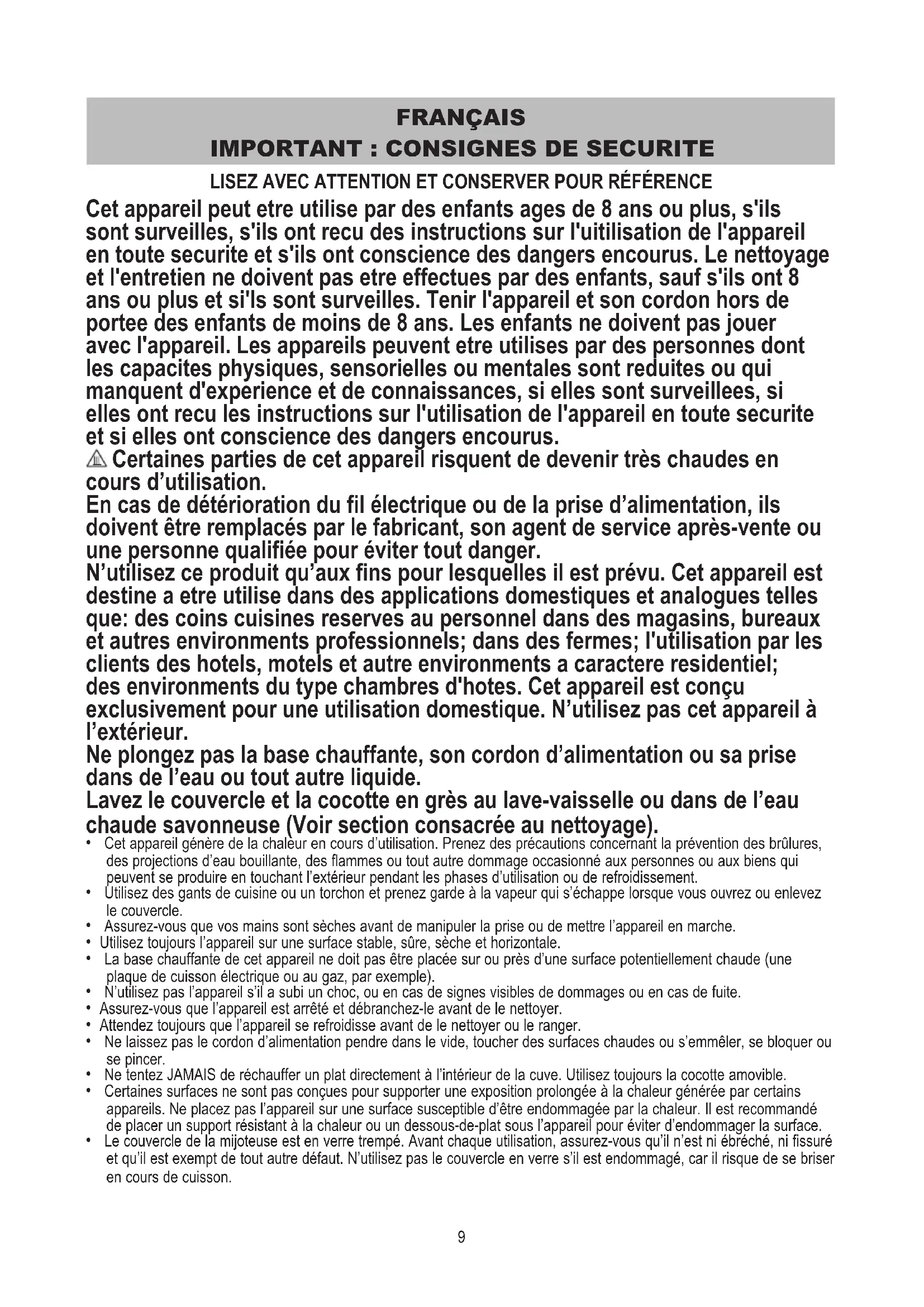 LISEZ AVEC ATTENTION ET CONSERVER POUR RÉFÉRENCE Cet appareil peut etre utilise par des enfants ages de 8 ans ou plus, s'ils sont surveilles, s'ils ont recu des instructions sur l'uitilisation de l'appareil en toute securite et s'ils ont conscience des dangers encourus. Le nettoyage et l'entretien ne doivent pas etre effectues par des enfants, sauf s'ils ont 8 ans ou plus et si'ls sont surveilles. Tenir l'appareil et son cordon hors de portee des enfants de moins de 8 ans. Les enfants ne doivent pas jouer avec l'appareil. Les appareils peuvent etre utilises par des personnes dont les capacites physiques, sensorielles ou mentales sont reduites ou qui manquent d'experience et de connaissances, si elles sont surveillees, si elles ont recu les instructions sur l'utilisation de l'appareil en toute securite et si elles ont conscience des dangers encourus. Certaines parties de cet appareil risquent de devenir très chaudes en cours d’utilisation. En cas de détérioration du fil électrique ou de la prise d’alimentation, ils doivent être remplacés par le fabricant, son agent de service après-vente ou une personne qualifiée pour éviter tout danger. N’utilisez ce produit qu’aux fins pour lesquelles il est prévu. Cet appareil est destine a etre utilise dans des applications domestiques et analogues telles que: des coins cuisines reserves au personnel dans des magasins, bureaux et autres environments professionnels; dans des fermes; l'utilisation par les clients des hotels, motels et autre environments a caractere residentiel; des environments du type chambres d'hotes. Cet appareil est conçu exclusivement pour une utilisation domestique. N’utilisez pas cet appareil à l’extérieur. Ne plongez pas la base chauffante, son cordon d’alimentation ou sa prise dans de l’eau ou tout autre liquide. Lavez le couvercle et la cocotte en grès au lave-vaisselle ou dans de l’eau chaude savonneuse (Voir section consacrée au nettoyage).