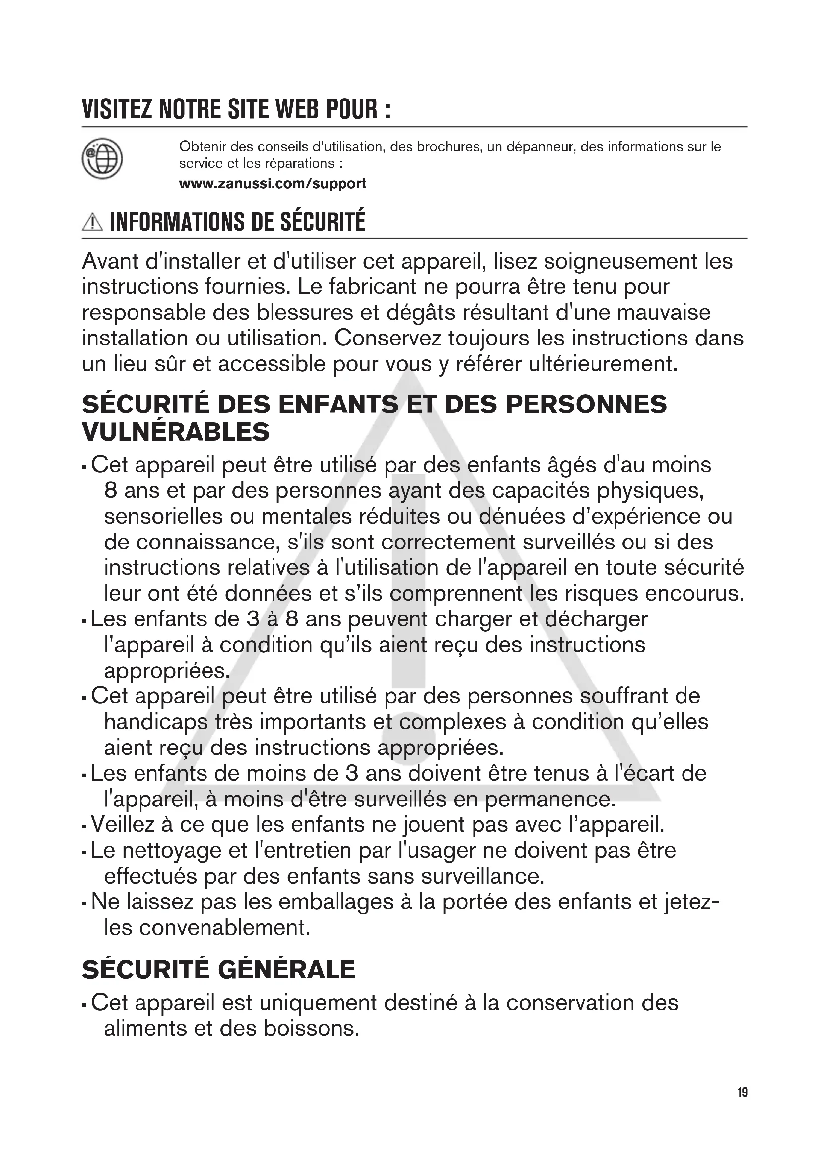 Avant d'installer et d'utiliser cet appareil, lisez soigneusement les instructions fournies. Le fabricant ne pourra être tenu pour responsable des blessures et dégâts résultant d'une mauvaise installation ou utilisation. Conservez toujours les instructions dans un lieu sûr et accessible pour vous y référer ultérieurement. SÉCURITÉ DES ENFANTS ET DES PERSONNES VULNÉRABLES
