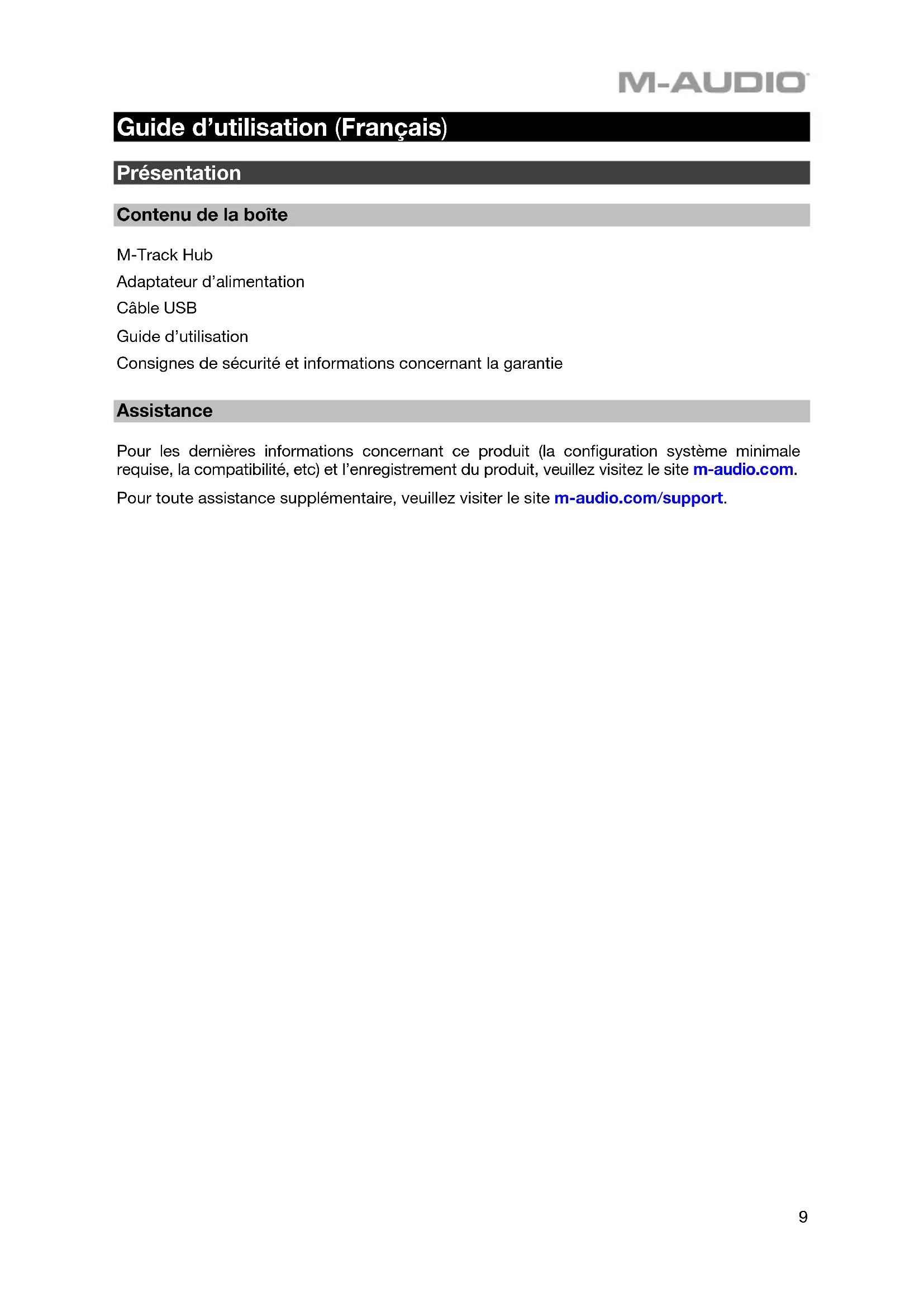 Guide d’utilisation (Français) Présentation Contenu de la boîte M-Track Hub Adaptateur d’alimentation Câble USB Guide d’utilisation Consignes de sécurité et informations concernant la garantie Assistance Pour les dernières informations concernant ce produit (la configuration système minimale requise, la compatibilité, etc) et l’enregistrement du produit, veuillez visitez le site m-audio.com. Pour toute assistance supplémentaire, veuillez visiter le site m-audio.com/support.10