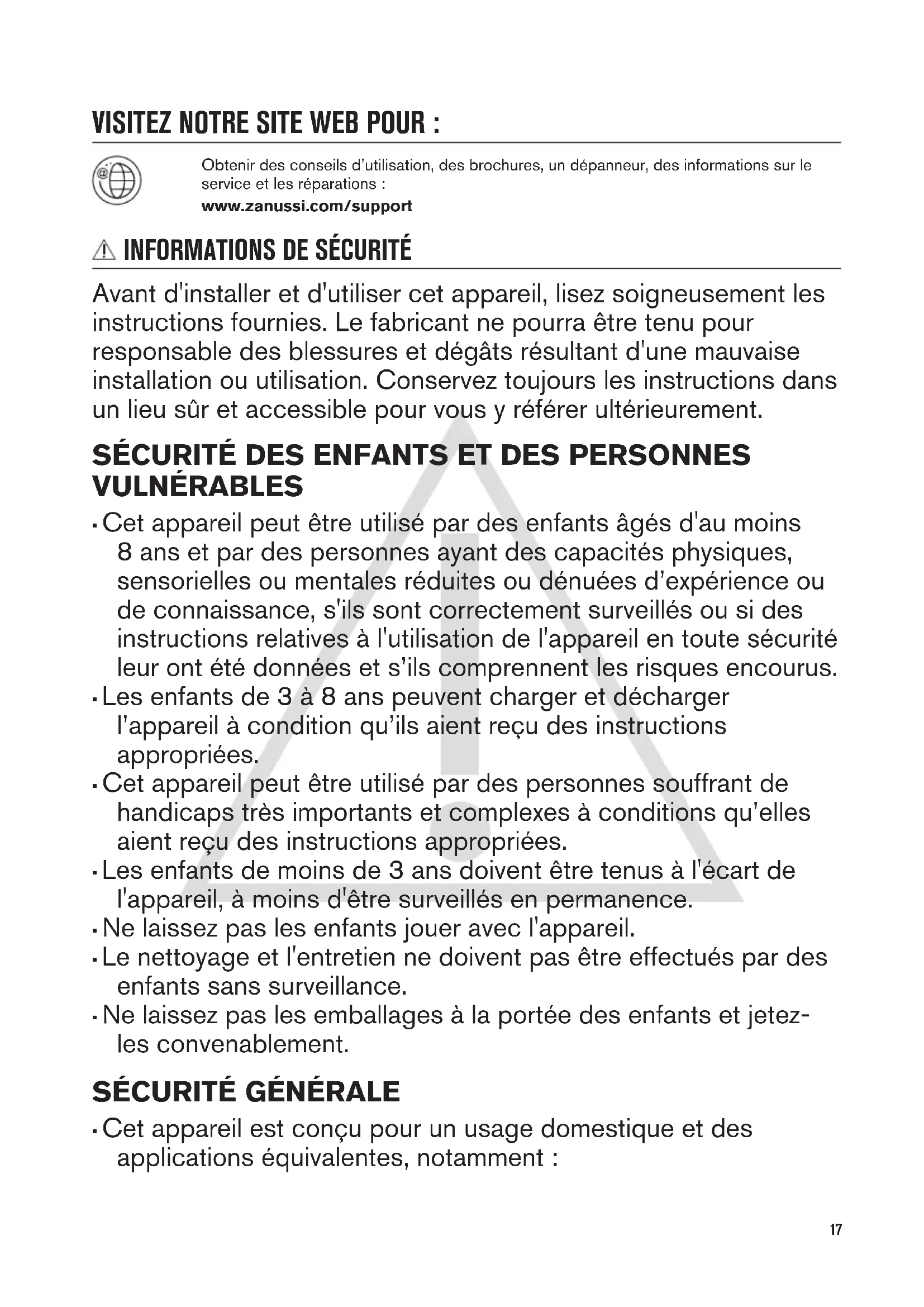 Avant d'installer et d'utiliser cet appareil, lisez soigneusement les instructions fournies. Le fabricant ne pourra être tenu pour responsable des blessures et dégâts résultant d'une mauvaise installation ou utilisation. Conservez toujours les instructions dans un lieu sûr et accessible pour vous y référer ultérieurement. SÉCURITÉ DES ENFANTS ET DES PERSONNES VULNÉRABLES