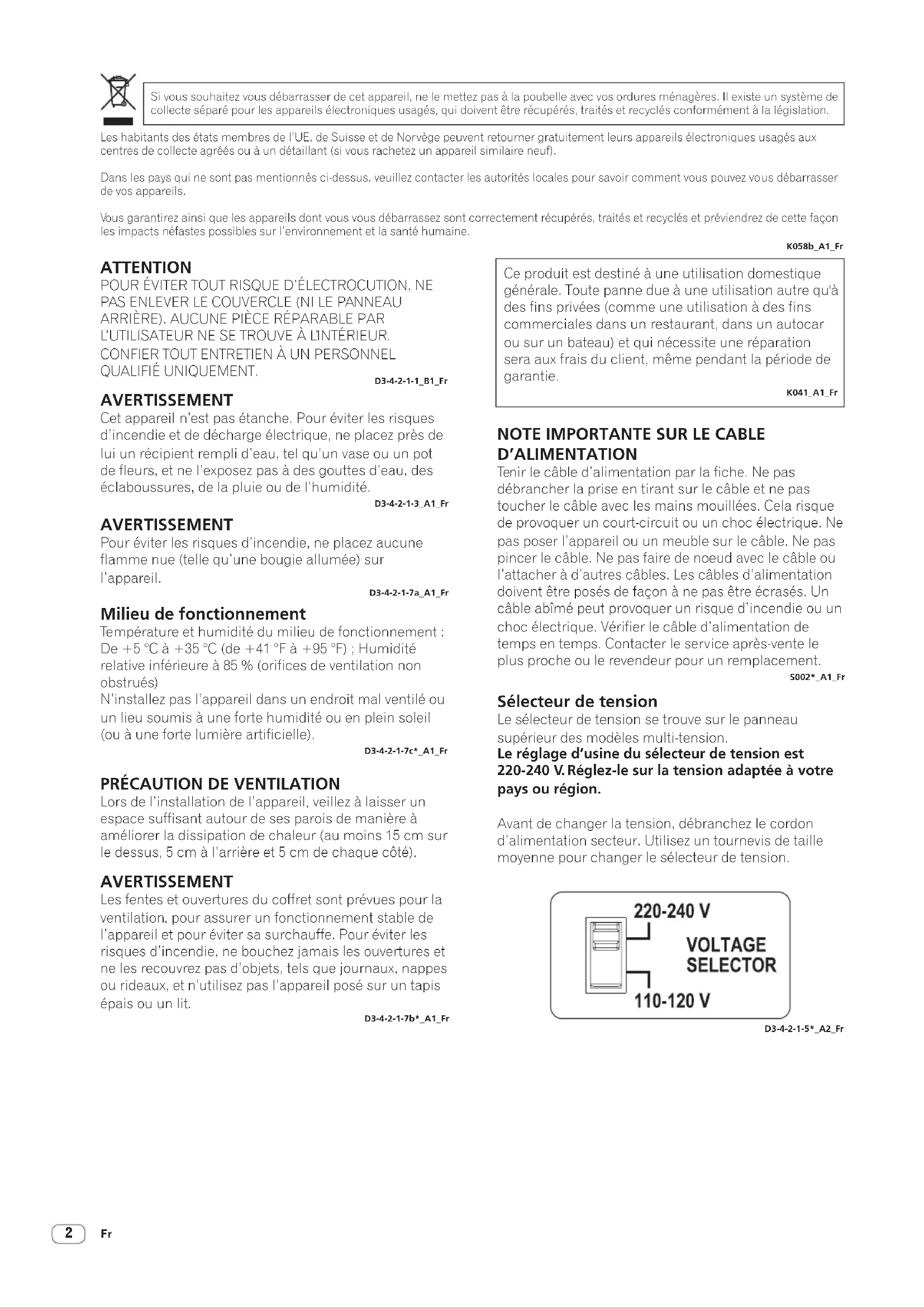 ATTENTION L’interrupteur POWER de cet appareil ne coupe pas complètement celui-ci de sa prise secteur. Comme le cordon d’alimentation fait office de dispositif de déconnexion du secteur, il devra être débranché au niveau de la prise secteur pour que l’appareil soit complètement hors tension. Par conséquent, veillez à installer l’appareil de telle manière que son cordon d’alimentation puisse être facilement débranché de la prise secteur en cas d’accident. Pour éviter tout risque d’incendie, le cordon d’alimentation sera débranché au niveau de la prise secteur si vous prévoyez une période prolongée de non utilisation (par exemple avant un départ en vacances). D3-4-2-2-2a*_A1_Fr FrançaisFr