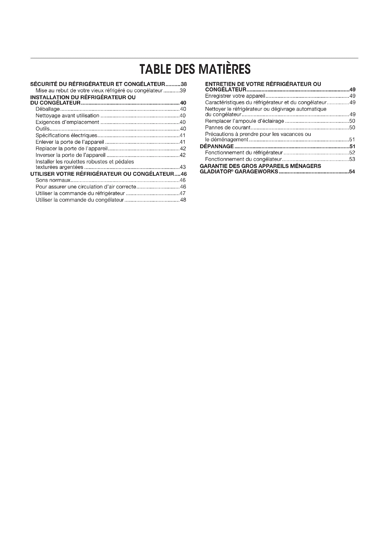 Le congélateur ne fonctionne pas Vérifier que l’appareil est branché sur une prise de courant à 3 alvéoles reliée à la terre. Vérifier que la commande de température est allumée. Vérifier qu’aucun programme de dégivrage automatique n’est en cours. Remplacer le fusible ou réenclencher le disjoncteur. REMARQUE : Si le problème persiste, appeler un électricien. Les lampes ne fonctionnent pas Vérifier que l’appareil est branché sur une prise de courant à 3 alvéoles reliée à la terre. Vérifier que l’ampoule est bien serrée dans la douille et qu’elle n’est pas grillée. Le bac de dégivrage contient de l’eau Il est normal que de l’eau s’égoutte dans le bac de dégivrage lorsque le congélateur est en cours de dégivrage. Lorsque le taux d’humidité est élevé, il est normal que l’eau dans le bac de dégivrage prenne plus de temps à s’évaporer. Le moteur semble fonctionner excessivement Vérifier que la porte ferme correctement. Dégivrer et nettoyer le congélateur afin de retirer l’excès de givre. L’ajout d’une grande quantité d’aliments réchauffe le congélateur, l’obligeant à fonctionner plus longtemps pour refroidir. Dans ce cas, prévoir un délai d’environ 6 à 8 heures pour que le congélateur atteigne la température adéquate. Retirer tous les articles souhaités en une seule fois, ranger les aliments de façon organisée et refermer la porte le plus vite possible. Vérifier que les serpentins du condenseur sont propres. Vérifier que le joint de la porte est hermétique sur toute la surface de contact. Si ce n’est pas le cas, contacter un technicien qualifié. Vérifier que l’espace autour du congélateur répond aux exigences en matière de circulation de l’air. Voir la section “Exigences d’emplacement”. REMARQUE : Si aucune des situations précédentes ne peut expliquer la situation, ne pas oublier que votre nouveau congélateur fonctionnera plus longtemps que l’ancien en raison de son moteur à haute efficacité. La température est trop élevée Vérifier que les ouvertures d’aération sont dégagées. Voir la section “Pour assurer une circulation d’air correcte” pour savoir où se trouvent les ouvertures d’aération. Retirer tous les articles souhaités en une seule fois, ranger les aliments de façon organisée et refermer la porte le plus vite possible. L’ajout d’une grande quantité d’aliments réchauffe le congélateur, l’obligeant à fonctionner plus longtemps pour refroidir. Vérifier que le réglage de la commande de température est adapté à l’environnement de l’appareil. La porte ne ferme pas complètement ou est difficile à ouvrir Vérifier qu’aucun emballage d’aliments n’empêche la fermeture de la porte. Sur certains modèles, vérifier que les tablettes et les paniers sont positionnés correctement. Vérifier que les joints sont propres. Voir la section “Entretien de votre réfrigérateur ou congélateur”. Vérifier que le congélateur est stable. Le congélateur émet un fort bourdonnement/ cliquetis Ajouter une grande quantité d’aliments fait réchauffer le congélateur. Plusieurs heures peuvent être nécessaires pour que le congélateur revienne à la température normale.SI VOUS AVEZ BESOIN DE SERVICE : 1. Avant de nous contacter pour obtenir un dépannage, veuillez déterminer si des réparations sont nécessaires pour votre produit. Certains problèmes peuvent être résolus sans intervention de dépannage. Prenez quelques minutes pour parcourir la section Dépannage du guide d’utilisation et d’entretien ou rendez-vous sur le site gladiatorgarageworks.ca. 2. Tout service sous garantie doit être effectué exclusivement par nos fournisseurs de dépannage autorisés Gladiator. Aux É.-U. et au Canada, dirigez toutes vos demandes de service sous garantie au : Centre d’eXpérience de la clientèle GladiatorAux É.-U., composez le 1 800 253-1301. Au Canada, composez le 1 800 807-6777. Si vous résidez à l’extérieur du Canada et des 50 États des États-Unis, contactez votre marchand Gladiator autorisé pour déterminer si une autre garantie s’applique.