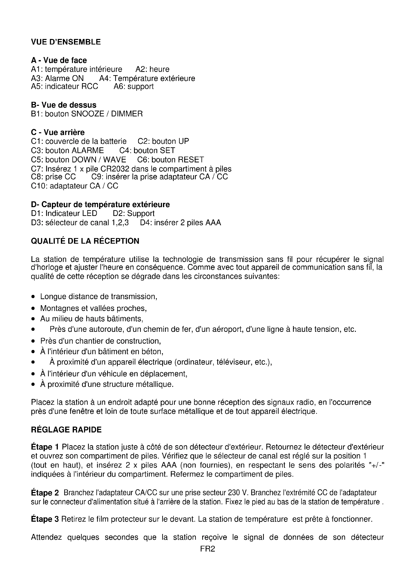 A - Vue de face A1: température intérieure A2: heure A3: Alarme ON A4: Température extérieure A5: indicateur RCC A6: support B- Vue de dessus B1: bouton SNOOZE / DIMMER C - Vue arrière C1: couvercle de la batterie C2: bouton UP C3: bouton ALARME C4: bouton SET C5: bouton DOWN / WAVE C6: bouton RESET C7: Insérez 1 x pile CR2032 dans le compartiment à piles C8: prise CC C9: insérer la prise adaptateur CA / CC C10: adaptateur CA / CC D- Capteur de température extérieure D1: Indicateur LED D2: Support D3: sélecteur de canal 1,2,3 D4: insérer 2 piles AAA