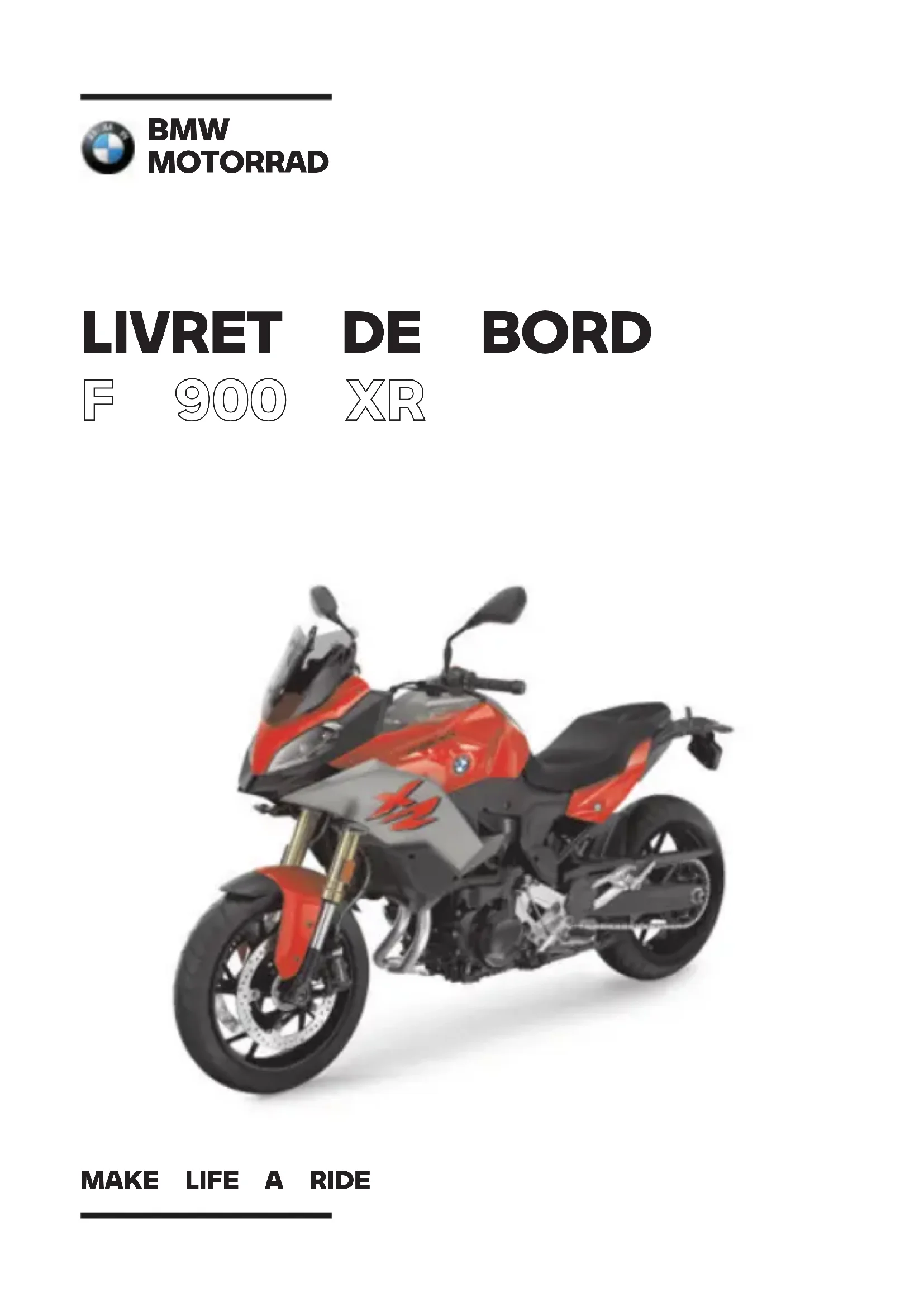 F 900 XR BMW MOTORRAD MAKE LIFE A RIDEDonnées de la moto Modèle Numéro d'identification du véhicule Code couleur Première immatriculation N° d'immatriculation Données du concessionnaire Interlocuteur au service après-vente Madame/Monsieur N° de téléphone Adresse du concessionnaire/Téléphone (cachet de la société)BIENVENUE CHEZ BMW Nous vous félicitons d'avoir porté votre choix sur un véhicule de BMW Motorrad et avons le plaisir de vous accueillir dans le cercle des pilotes BMW. Familiarisez-vous avec votre nouveau véhicule afin d'être en mesure de vous déplacer en toute sécurité sur les routes. À propos de ce livret de bord Lisez le livret de bord avant de démarrer votre nouvelle BMW. Vous y trouverez des indications importantes concernant l'utilisa- tion du véhicule qui vous permettront de profiter pleinement des avantages techniques de votre BMW. Vous y trouverez également des informations sur l'entretien et la maintenance de façon à assurer la sécurité de fonctionnement, la sécurité routière et une conservation optimale de la valeur de votre véhicule. Si vous étiez amené à vendre un jour votre BMW, pensez à re- mettre le livret de bord. Il fait partie intégrante de la moto. Nous espérons que votre BMW vous donnera entière satisfaction et vous souhaitons bonne route BMW Motorrad.01