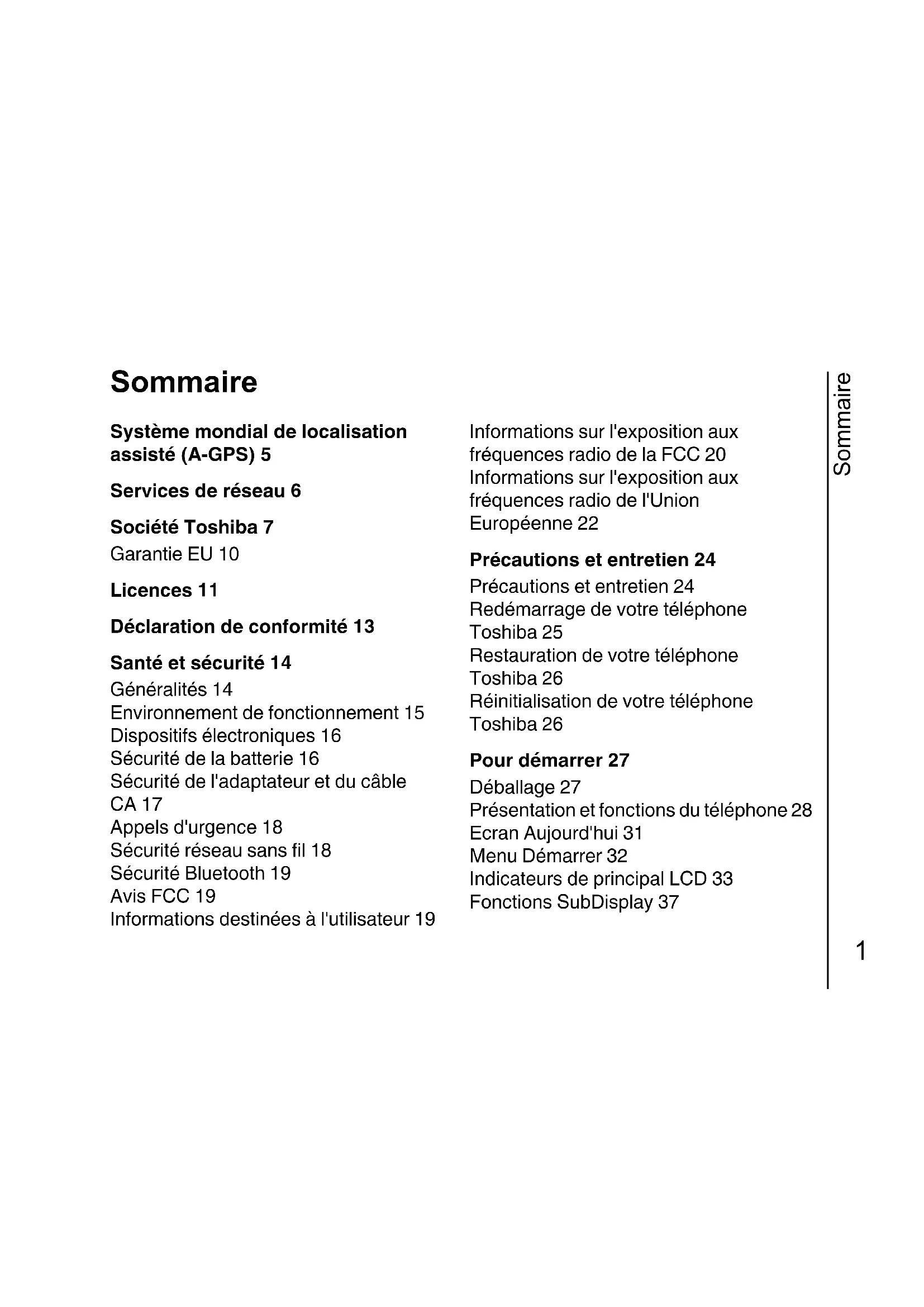 Sommaire Système mondial de localisation assisté (A-GPS) 5 Services de réseau 6 Société Toshiba 7 Garantie EU 10 Licences 11 Déclaration de conformité 13 Santé et sécurité 14 Généralités 14 Environnement de fonctionnement 15 Dispositifs électroniques 16 Sécurité de la batterie 16 Sécurité de l'adaptateur et du câble CA 17 Appels d'urgence 18 Sécurité réseau sans fil 18 Sécurité Bluetooth 19 Avis FCC 19 Informations destinées à l'utilisateur 19 Informations sur l'exposition aux fréquences radio de la FCC 20 Informations sur l'exposition aux fréquences radio de l'Union Européenne 22 Précautions et entretien 24 Précautions et entretien 24 Redémarrage de votre téléphone Toshiba 25 Restauration de votre téléphone Toshiba 26 Réinitialisation de votre téléphone Toshiba 26 Pour démarrer 27 Déballage 27 Présentation et fonctions du téléphone 28 Ecran Aujourd'hui 31 Menu Démarrer 32 Indicateurs de principal LCD 33 Fonctions SubDisplay 37 G910_UM_FR_covered.book Page 1 Friday, February 8, 2008 9:47 AMSommaire