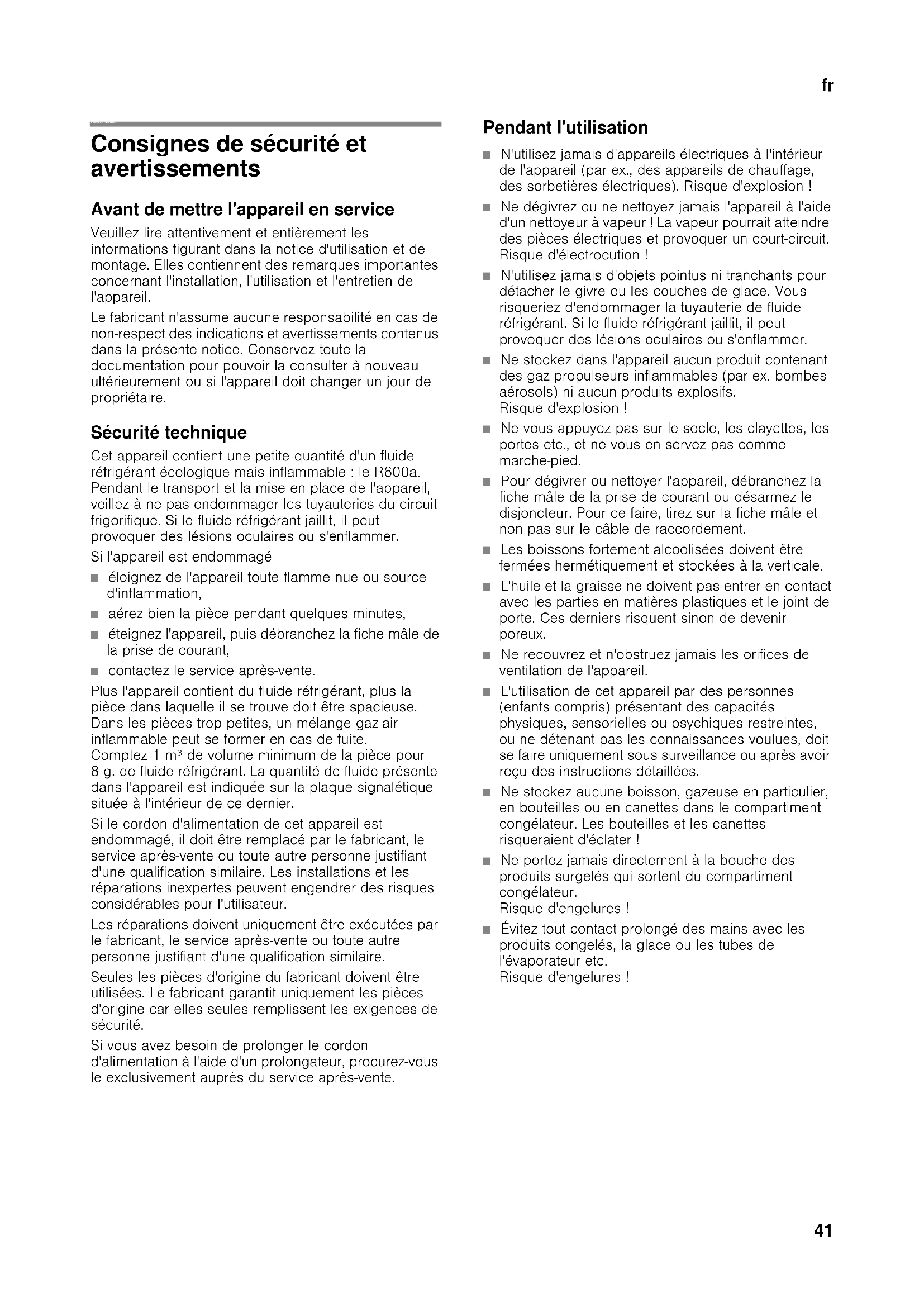 frTable des matières frNotice d'utilisation Consignes de sécurité et avertissements Avant de mettre l'appareil en service Veuillez lire attentivement et entièrement les informations figurant dans la notice d'utilisation et de montage. Elles contiennent des remarques importantes concernant l'installation, l'utilisation et l'entretien de l'appareil. Le fabricant n'assume aucune responsabilité en cas de non-respect des indications et avertissements contenus dans la présente notice. Conservez toute la documentation pour pouvoir la consulter à nouveau ultérieurement ou si l'appareil doit changer un jour de propriétaire. Sécurité technique Cet appareil contient une petite quantité d'un fluide réfrigérant écologique mais inflammable : le R600a. Pendant le transport et la mise en place de l'appareil, veillez à ne pas endommager les tuyauteries du circuit frigorifique. Si le fluide réfrigérant jaillit, il peut provoquer des lésions oculaires ou s'enflammer. Si l'appareil est endommagé ■ éloignez de l'appareil toute flamme nue ou source d'inflammation, ■ aérez bien la pièce pendant quelques minutes, ■ éteignez l'appareil, puis débranchez la fiche mâle de la prise de courant, ■ contactez le service après-vente. Plus l'appareil contient du fluide réfrigérant, plus la pièce dans laquelle il se trouve doit être spacieuse. Dans les pièces trop petites, un mélange gaz-air inflammable peut se former en cas de fuite. Comptez 1 m³ de volume minimum de la pièce pour 8 g. de fluide réfrigérant. La quantité de fluide présente dans l'appareil est indiquée sur la plaque signalétique située à l'intérieur de ce dernier. Si le cordon d'alimentation de cet appareil est endommagé, il doit être remplacé par le fabricant, le service après-vente ou toute autre personne justifiant d'une qualification similaire. Les installations et les réparations inexpertes peuvent engendrer des risques considérables pour l'utilisateur. Les réparations doivent uniquement être exécutées par le fabricant, le service après-vente ou toute autre personne justifiant d'une qualification similaire. Seules les pièces d'origine du fabricant doivent être utilisées. Le fabricant garantit uniquement les pièces d'origine car elles seules remplissent les exigences de sécurité. Si vous avez besoin de prolonger le cordon d'alimentation à l'aide d'un prolongateur, procurez-vous le exclusivement auprès du service après-vente. Pendant l'utilisation ■ N'utilisez jamais d'appareils électriques à l'intérieur de l'appareil (par ex., des appareils de chauffage, des sorbetières électriques). Risque d'explosion ! ■ Ne dégivrez ou ne nettoyez jamais l'appareil à l'aide d'un nettoyeur à vapeur ! La vapeur pourrait atteindre des pièces électriques et provoquer un court-circuit. Risque d'électrocution ! ■ N'utilisez jamais d'objets pointus ni tranchants pour détacher le givre ou les couches de glace. Vous risqueriez d'endommager la tuyauterie de fluide réfrigérant. Si le fluide réfrigérant jaillit, il peut provoquer des lésions oculaires ou s'enflammer. ■ Ne stockez dans l'appareil aucun produit contenant des gaz propulseurs inflammables (par ex. bombes aérosols) ni aucun produits explosifs. Risque d'explosion ! ■ Ne vous appuyez pas sur le socle, les clayettes, les portes etc., et ne vous en servez pas comme marche-pied. ■ Pour dégivrer ou nettoyer l'appareil, débranchez la fiche mâle de la prise de courant ou désarmez le disjoncteur. Pour ce faire, tirez sur la fiche mâle et non pas sur le câble de raccordement. ■ Les boissons fortement alcoolisées doivent être fermées hermétiquement et stockées à la verticale. ■ L'huile et la graisse ne doivent pas entrer en contact avec les parties en matières plastiques et le joint de porte. Ces derniers risquent sinon de devenir poreux. ■ Ne recouvrez et n'obstruez jamais les orifices de ventilation de l'appareil. ■ L'utilisation de cet appareil par des personnes (enfants compris) présentant des capacités physiques, sensorielles ou psychiques restreintes, ou ne détenant pas les connaissances voulues, doit se faire uniquement sous surveillance ou après avoir reçu des instructions détaillées. ■ Ne stockez aucune boisson, gazeuse en particulier, en bouteilles ou en canettes dans le compartiment congélateur. Les bouteilles et les canettes risqueraient d'éclater ! ■ Ne portez jamais directement à la bouche des produits surgelés qui sortent du compartiment congélateur. Risque d'engelures ! ■ Évitez tout contact prolongé des mains avec les produits congelés, la glace ou les tubes de l'évaporateur etc. Risque d'engelures !fr