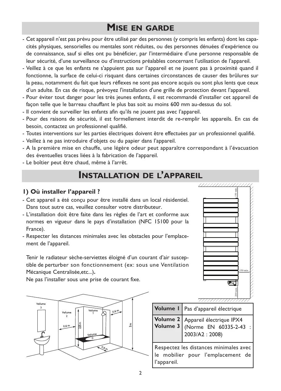 Volume 1 Pas d’appareil électrique Volume 2 Appareil électrique IPX4 Volume 3 (Norme EN 60335-2-43 : 2003/A2 : 2008) Respectez les distances minimales avec le mobilier pour l’emplacement de l’appareil. 2