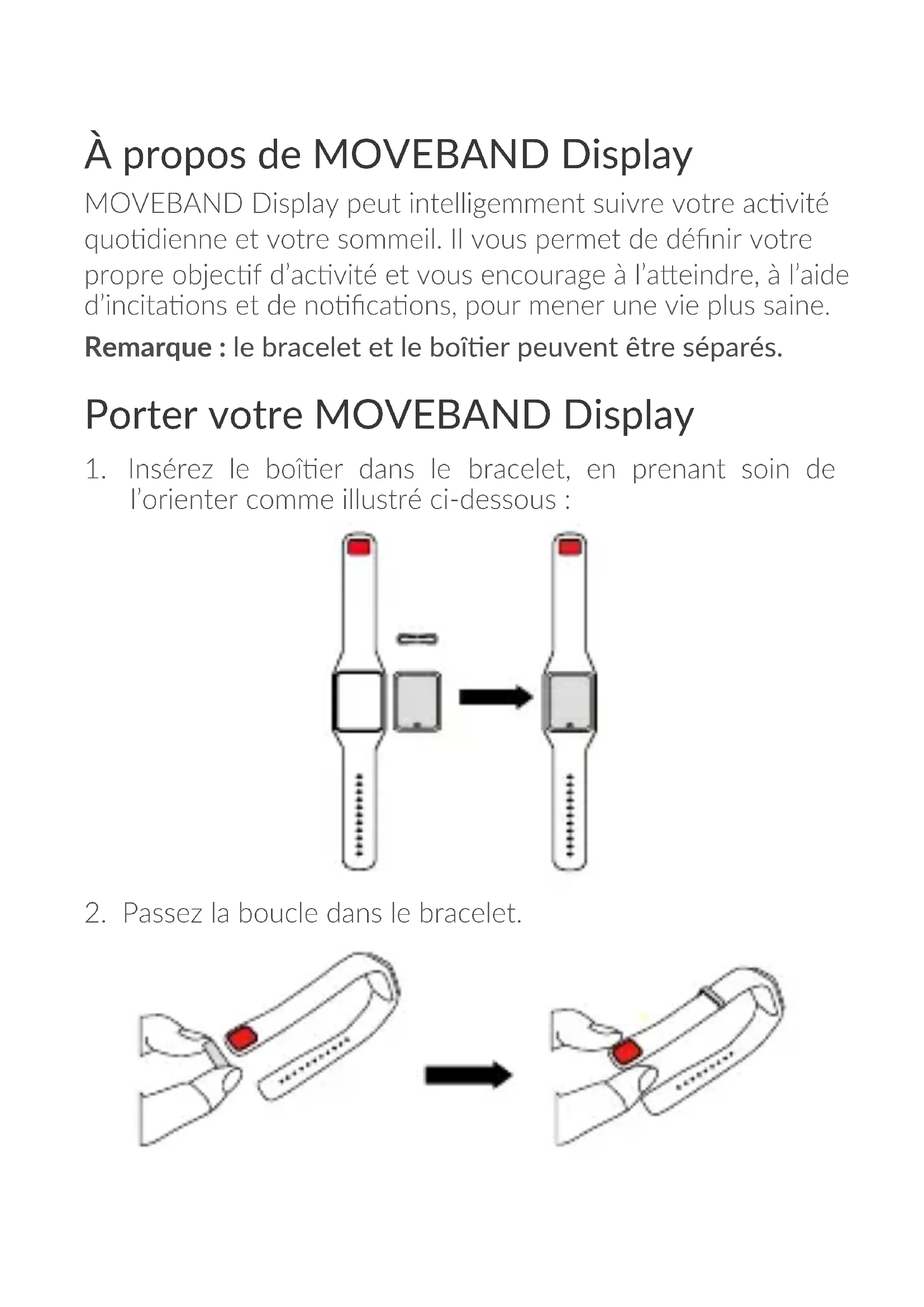Guide d’ulisaon rapide MOVEBAND Display CJB1HD0LCABAÀ propos de MOVEBAND Display MOVEBAND Display peut intelligemment suivre votre acvité quodienne et votre sommeil. Il vous permet de dénir votre propre objecf d’acvité et vous encourage à l’aeindre, à l’aide d’incitaons et de nocaons, pour mener une vie plus saine. Remarque : le bracelet et le boîer peuvent être séparés. Porter votre MOVEBAND Display