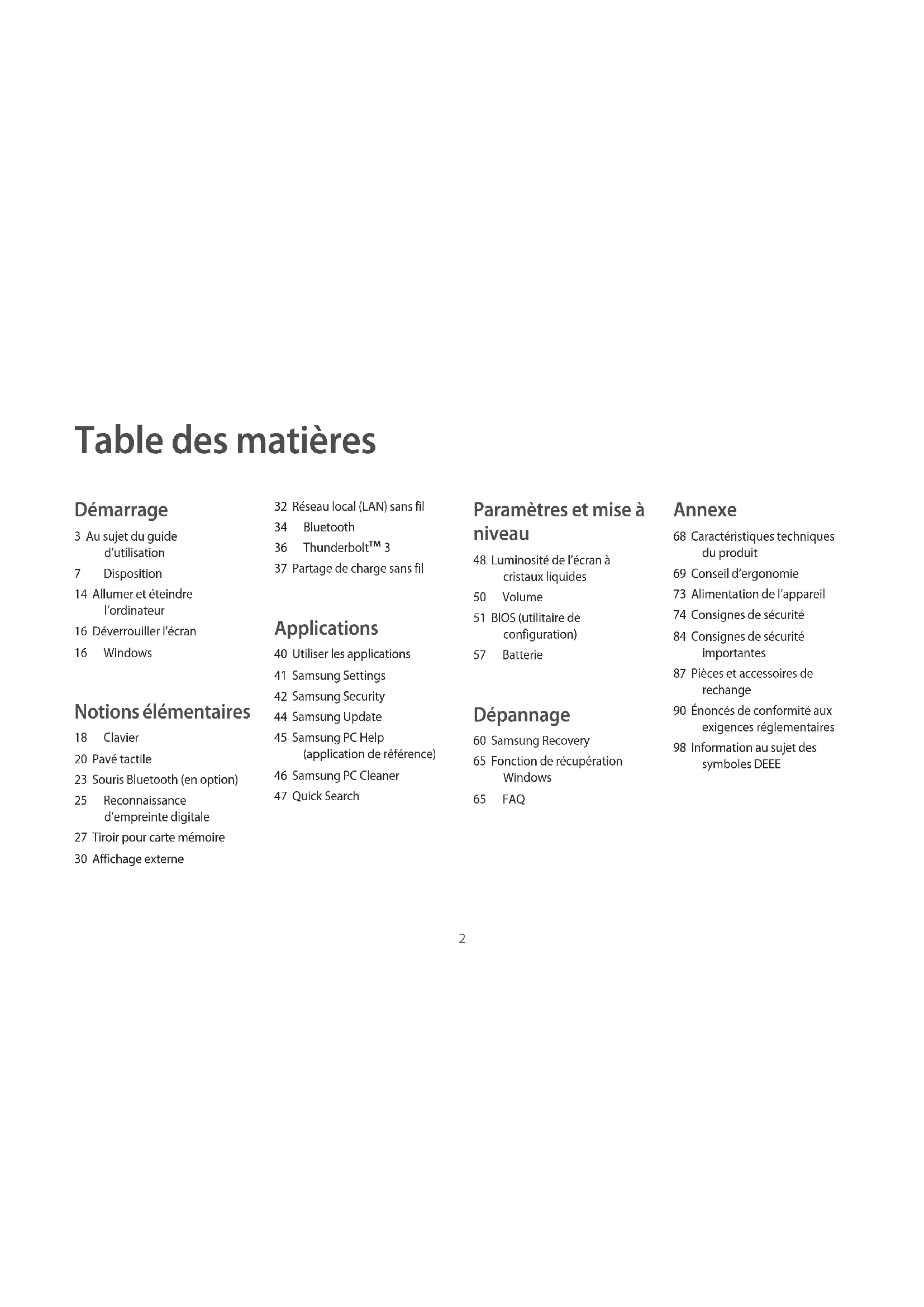 Samsung et le logo Samsung sont des marques de commerce ou des marques déposées de Samsung Electronics Co., Ltd. Intel et Core sont des marques de commerce ou des marques déposées de Intel Corporation. Microsoft, MS-DOS et Windows sont des marques de commerce ou des marques déposées de Microsoft Corporation. Bluetooth® est une marque déposée de Bluetooth SIG, Inc. partout dans le monde.