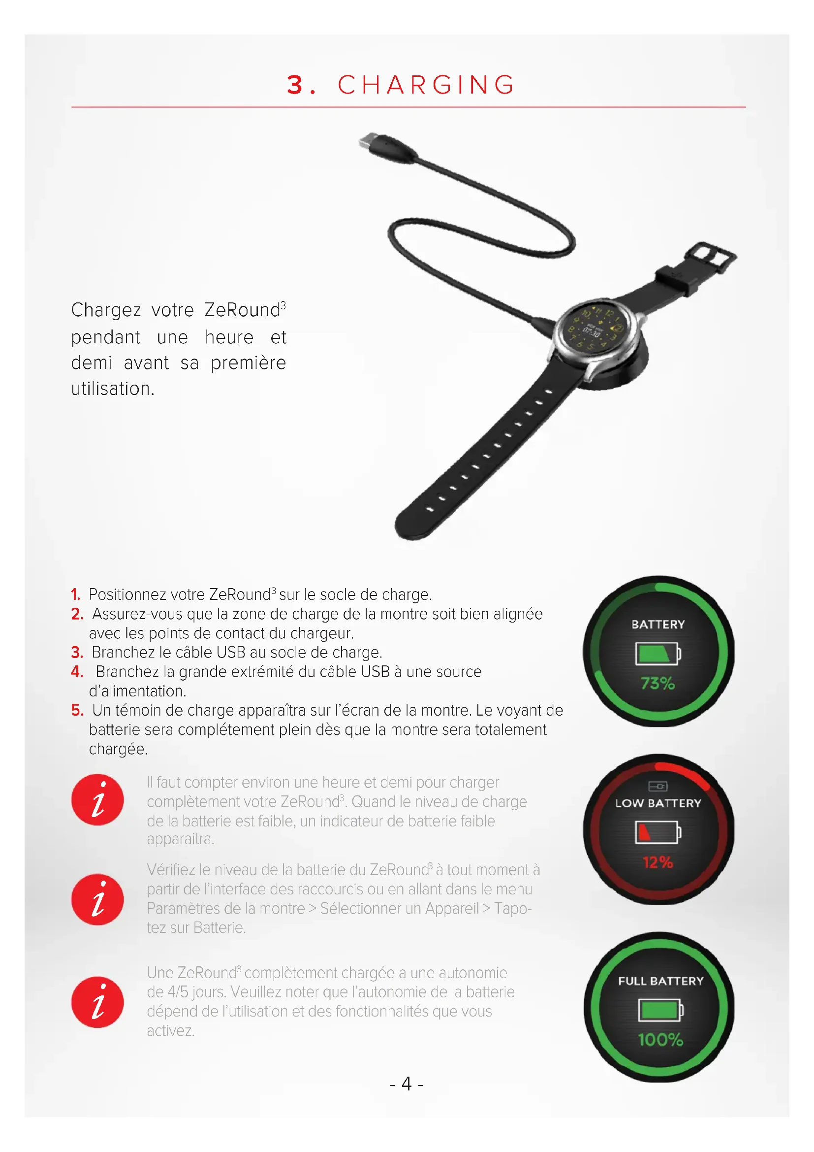 batterie sera complétement plein dès que la montre sera totalement chargée. Il faut compter environ une heure et demi pour charger complètement votre ZeRound