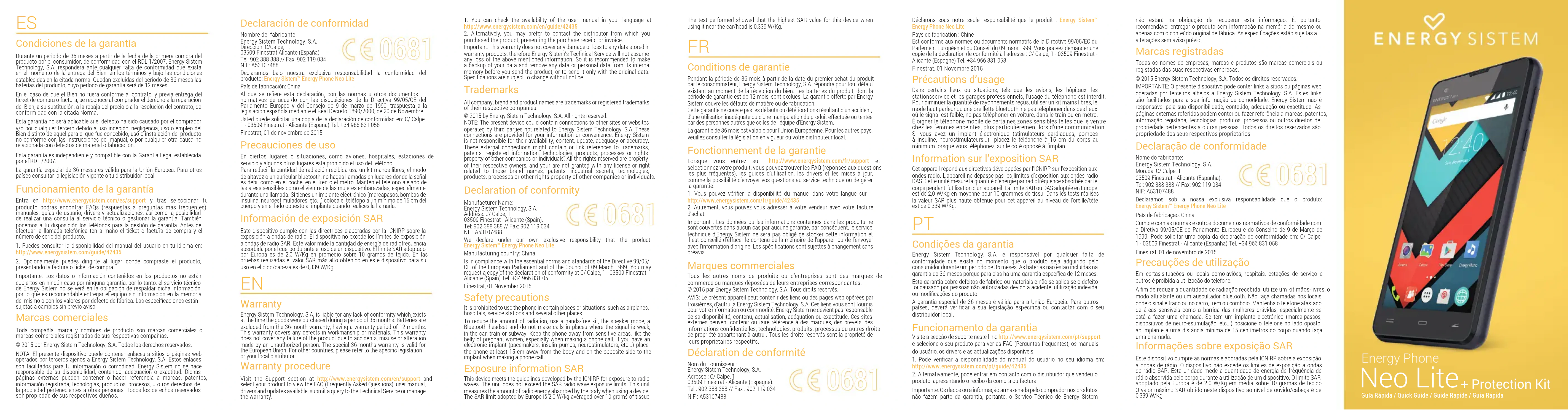 1. You can check the availability of the user manual in your language at http://www.energysistem.com/en/guide/424352. Alternatively, you may prefer to contact the distributor from which you purchased the product, presenting the purchase receipt or invoice.Important: This warranty does not cover any damage or loss to any data stored in warranty products, therefore Energy Sistem’s Technical Service will not assume any loss of the above mentioned information. So it is recommended to make a backup of your data and remove any data or personal data from its internal memory before you send the product, or to send it only with the original data. Specications are subject to change without notice.Safety precautionsIt is prohibited to use the phone in certain places or situations, such as airplanes, hospitals, service stations and several other places.To reduce the amount of radiation, use a hands-free kit, the speaker mode, a Bluetooth headset and do not make calls in places where the signal is weak, in the car, train or subway. Keep the phone away from sensitive areas, like the belly of pregnant women, especially when making a phone call. If you have an electronic implant (pacemakers, insulin pumps, neurostimulators, etc...) place the phone at least 15 cm away from the body and on the opposite side to the implant when making a phone call.Exposure information SARThis device meets the guidelines developed by the ICNIRP for exposure to radio waves. The unit does not exceed the SAR radio wave exposure limits. This unit measures the amount of radio energy absorbed by the body when using a device. The SAR limit adopted by Europe is 2,0 W/kg averaged over 10 grams of tissue. The test performed showed that the highest SAR value for this device when using it near the ear/head is 0,339 W/Kg.Conditions de garantiePendant la période de 36 mois à partir de la date du premier achat du produit par le consommateur, Energy Sistem Technology, S.A. répondra pour tout défaut existant au moment de la réception du bien. Les batteries du produit, dont la période de garantie est de 12 mois, sont exclues. La garantie offerte par Energy Sistem couvre les défauts de matière ou de fabrication.Cette garantie ne couvre pas les défauts ou détériorations résultant d’un accident, d’une utilisation inadéquate ou d’une manipulation du produit effectuée ou tentée par des personnes autres que celles de l’équipe d’Energy Sistem.La garantie de 36 mois est valable pour l’Union Européenne. Pour les autres pays, veuillez consulter la législation en vigueur ou votre distributeur local.Fonctionnement de la garantieLorsque vous entrez sur http://www.energysistem.com/fr/support sélectionnez votre produit, vous pouvez trouver les FAQ (réponses aux questions les plus fréquentes), les guides d’utilisation, les drivers et les mises à jour, comme la possibilité d’envoyer vos questions au service technique ou de gérer la garantie.1. Vous pouvez vérier la disponibilité du manuel dans votre langue sur http://www.energysistem.com/fr/guide/424352. Autrement, vous pouvez vous adresser à votre vendeur avec votre facture d’achat.Important : Les données ou les informations contenues dans les produits ne sont couvertes dans aucun cas par aucune garantie, par conséquent, le service technique d’Energy Sistem ne sera pas obligé de stocker cette information et il est conseillé d’effacer le contenu de la mémoire de l’appareil ou de l’envoyer avec l’information d’origine. Les spécications sont sujettes à changement sans préavis.Marques commercialesTous les autres noms de produits ou d’entreprises sont des marques de commerce ou marques déposées de leurs entreprises correspondantes.© 2015 par Energy Sistem Technology, S.A. Tous droits réservés.AVIS: Le présent appareil peut contenir des liens ou des pages web opérées par troisièmes, d’autrui à Energy Sistem Technology, S.A. Ces liens vous sont fournis pour votre information ou commodité; Energy Sistem ne devient pas responsable de sa disponibilité, contenu, actualisation, adéquation ou exactitude. Ces sites externes peuvent contenir ou faire référence à des marques, des brevets, des informations condentielles, technologies, produits, processus ou autres droits de propriété appartenant à autrui. Tous les droits réservés sont la propriété de leurs propriétaires respectifs.Déclaration de conformitéNom du Fournisseur : Energy Sistem Technology, S.A. Adresse : C/ Calpe, 1 03509 Finestrat - Alicante (Espagne). Tel : 902 388 388 // Fax : 902 119 034 NIF : A53107488Déclarons sous notre seule responsabilité que le produit : Energy Sistem™ Energy Phone Neo LitePays de fabrication : ChineEst conforme aux normes ou documents normatifs de la Directive 99/05/EC du Parlement Européen et du Conseil du 09 mars 1999. Vous pouvez demander une copie de la declaration de conformité à l’adresse : C/ Calpe, 1 - 03509 Finestrat - Alicante (Espagne) Tel. +34 966 831 058Finestrat, 01 Novembre 2015Précautions d’usageDans certains lieux ou situations, tels que les avions, les hôpitaux, les stationsservice et les garages professionnels, l’usage du téléphone est interdit.Pour diminuer la quantité de rayonnements reçus, utiliser un kit mains libres, le mode haut parleur ou une oreillette bluetooth, ne pas téléphoner dans des lieux où le signal est faible, ne pas téléphoner en voiture, dans le train ou en métro. Éloigner le téléphone mobile de certaines zones sensibles telles que le ventre chez les femmes enceintes, plus particulièrement lors d’une communication. Si vous avez un implant électronique (stimulateurs cardiaques, pompes à insuline, neurostimulateurs...) placez le téléphone à 15 cm du corps au minimum lorsque vous téléphonez, sur le côté opposé à l’implant. Information sur l’exposition SARCet appareil répond aux directives développées par l’ICNIRP sur l’exposition aux ondes radio. L’a