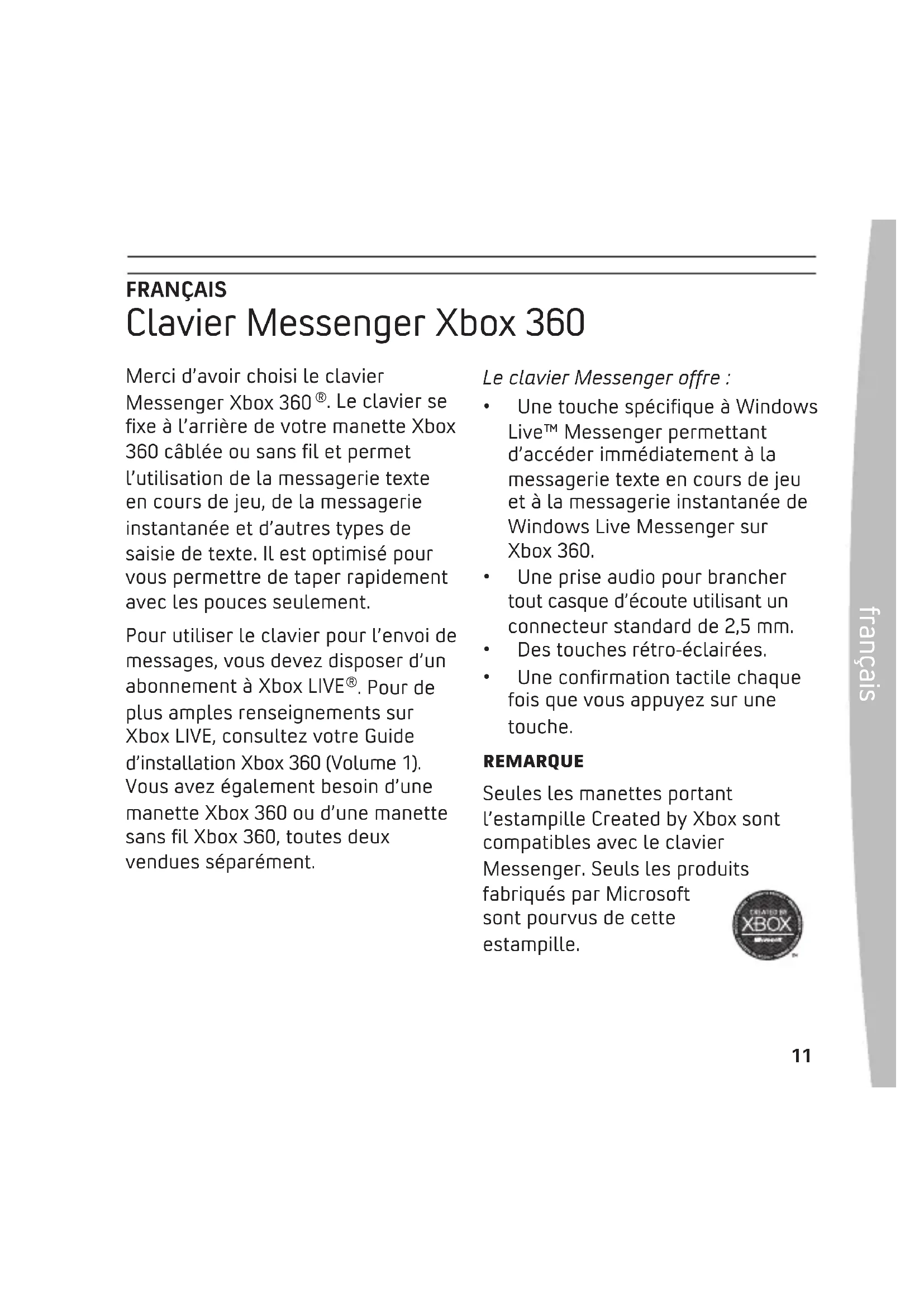 - Uneconrmationtactilechaque foisquevousappuyezsurune touche. REMARQUE Seules les manettes portant l’estampille Created by Xbox sont compatiblesavecleclavier Messenger. Seuls les produits fabriqués par Microsoft sontpourvusdecette estampille. fRAnÇAis ClavierMessengerXbox36012 français