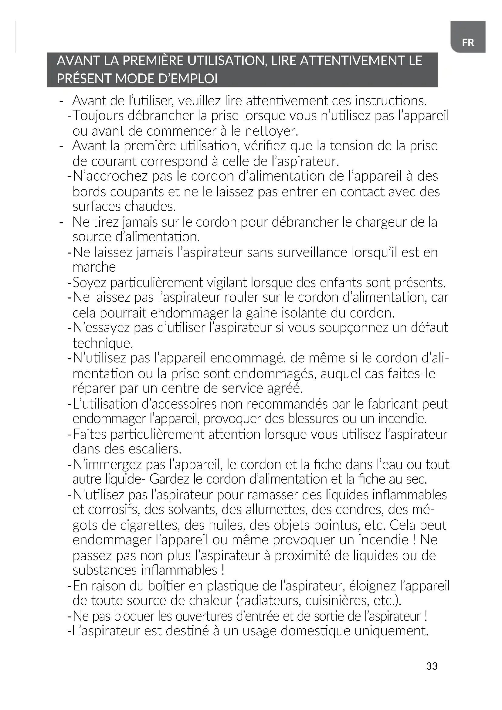 N’ulisez pas l’aspirateur pour ramasser des liquides inammables et corrosifs, des solvants, des allumees, des cendres, des mé- gots de cigarees, des huiles, des objets pointus, etc. Cela peut endommager l’appareil ou même provoquer un incendie ! Ne passez pas non plus l’aspirateur à proximité de liquides ou de substances inammables !