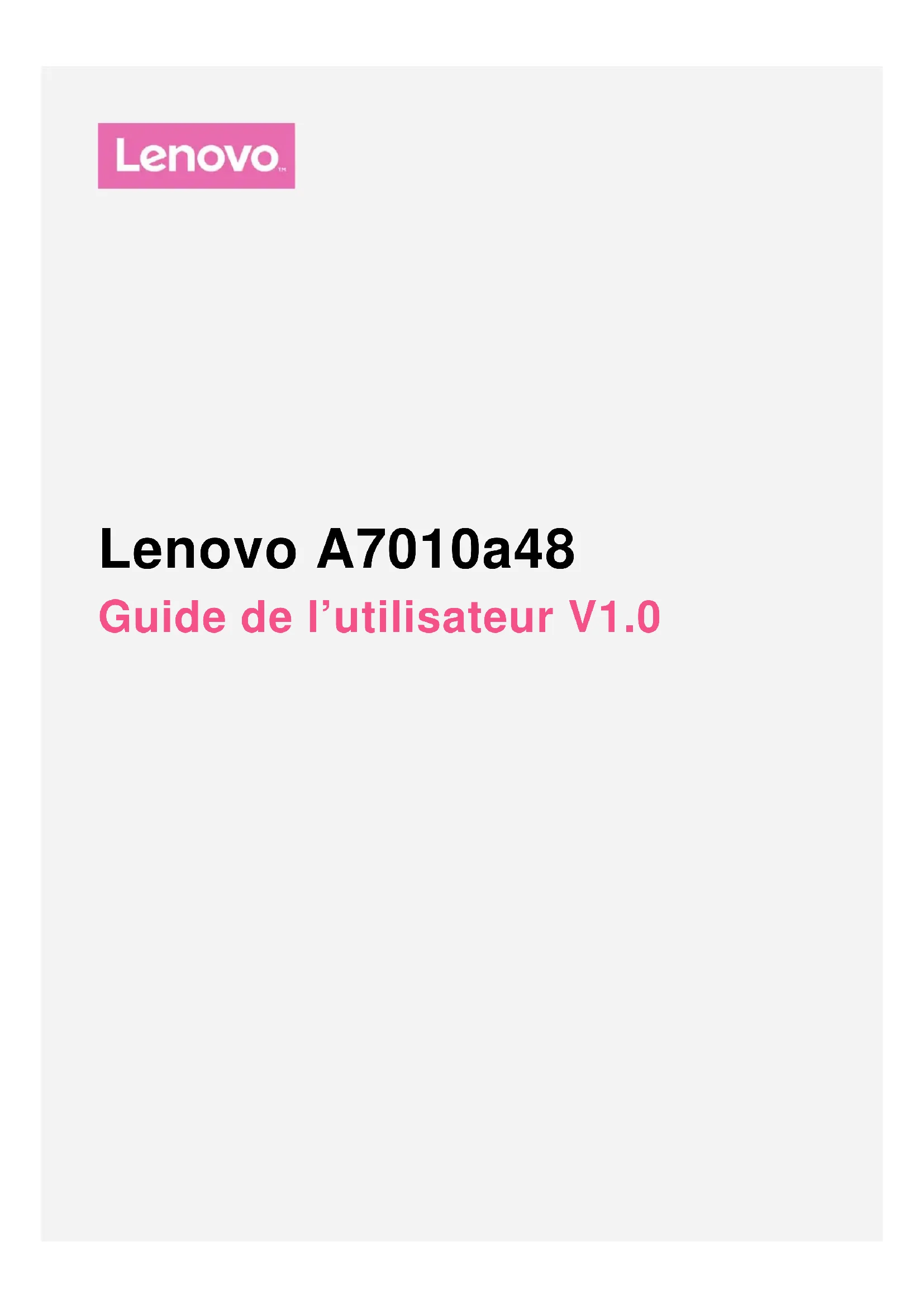 Lenovo A7010a48 Guide de l’utilisateur V1.0Présentation Avant d’utiliser ce document et le produit associé, prenez connaissance des informations suivantes : Guide de démarrage rapide Notice relative à la réglementation Annexe Les documents Guide de démarrage rapide et Notice relative à la réglementation sont disponibles sur le site Web http://support.lenovo.com. Caractéristiques techniques Cette section répertorie les caractéristiques techniques relatives aux communications sans fil uniquement. Pour afficher une liste des caractéristiques techniques de votre téléphone, rendez-vous sur http://support.lenovo.com. Données