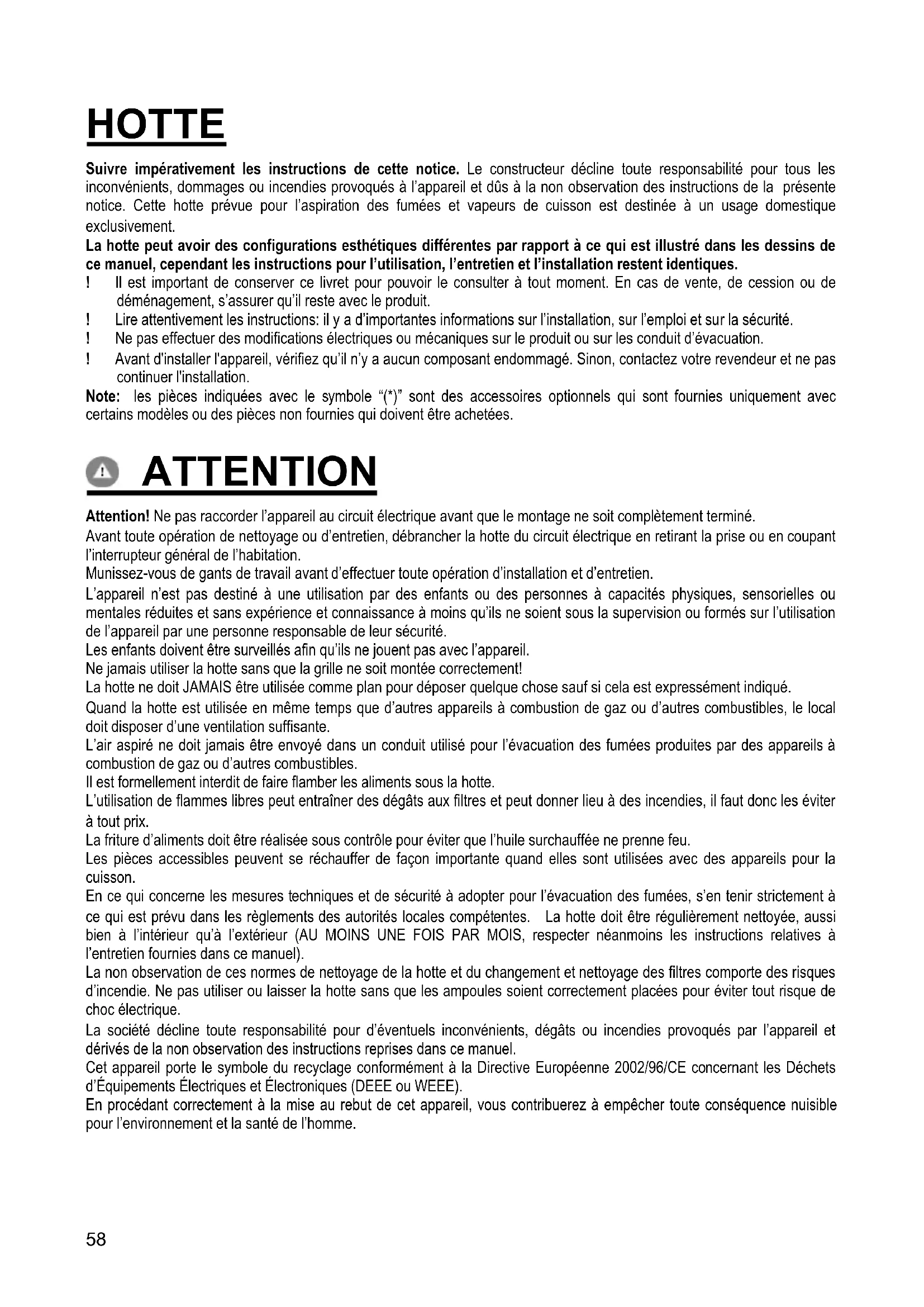 - CEM : EN 55014-1 ; CISPR 14-1 ; EN 55014-2 ; CISPR 14-2 ; EN/CEI 61000-3-2 ; EN/CEI 61000-3-3. Suggestions pour une utilisation correcte afin de réduire l’impact environnemental : Allumer la hotte à la vitesse minimum pendant la cuisson et la laisser fonctionner pendant quelques minutes après la fin de la cuisson. Augmenter la vitesse uniquement en présence d’une grande quantité de fumée ou de vapeur et n’utiliser la/les vitesse(s) accélérées que dans les cas extrêmes. Remplacer le(s) filtre(s) au charbon lorsque cela est nécessaire afin de maintenir une réduction efficace des odeurs. Nettoyer le(s) filtres à graisse lorsque cela est nécessaire afin de maintenir un filtrage efficace des graisses. Utiliser un système de tuyauterie du diamètre maximum indiqué dans ce manuel afin d’optimiser le rendement et de minimiser le bruit. ATTENTION! Ne pas installer les vis et les éléments de fixation conformément à ces instructions peut entraîner des risques électriques. UTILISATION La hotte est réalisée de façon qu’elle puisse être utilisée en version aspirante à évacuation extérieure, ou filtrante à recyclage intérieur. Version évacuation extérieure Les vapeurs sont évacuées vers l'extérieur à travers un conduit d'évacuation fixé à la bride de raccord qui se trouve au- dessus de la hotte. Attention! Le tuyau d’évacuation n’est pas fourni et doit être acheté à part. Le diamètre du tuyau d'évacuation doit être égal à celui de la bride de raccord. Sur la partie horizontale, le tuyau doit avoir une légère inclinaison vers le haut (10° env.) de façon à convoyer plus facilement l’air vers l’extérieur. Si la hotte est équipée d'un filtre à charbon, ce dernier doit être enlevé. Relier la hotte aux tubes et trous d’évacuation de la paroi d’un diamètre équivalent à la sortie de l’air (collier de raccord). L’utilisation de tubes et des trous d'évacuation à paroi avec un diamètre inférieur entraînera une diminution des performances d’aspiration et une nette augmentation du bruit. Nous déclinons toute responsabilité à cet égard. ! Utiliser un tuyau de la longueur strictement nécessaire. ! Les coudes du tuyau doivent être en nombre minime (angle maxi du coude: 90°). ! Éviter les variations excessives de section du tuyau. ! Utiliser un tuyau le plus lisse possible sur sa partie interne. ! Le matériau du tuyau doit être aux normes. Version recyclage Il convient d’utiliser un filtre à charbon actif, disponible auprès de vôtre revendeur habituel. L’air aspiré sera dégraissé et désodorisé avant d’être refoulé dans la pièce à travers la grille supérieure.60