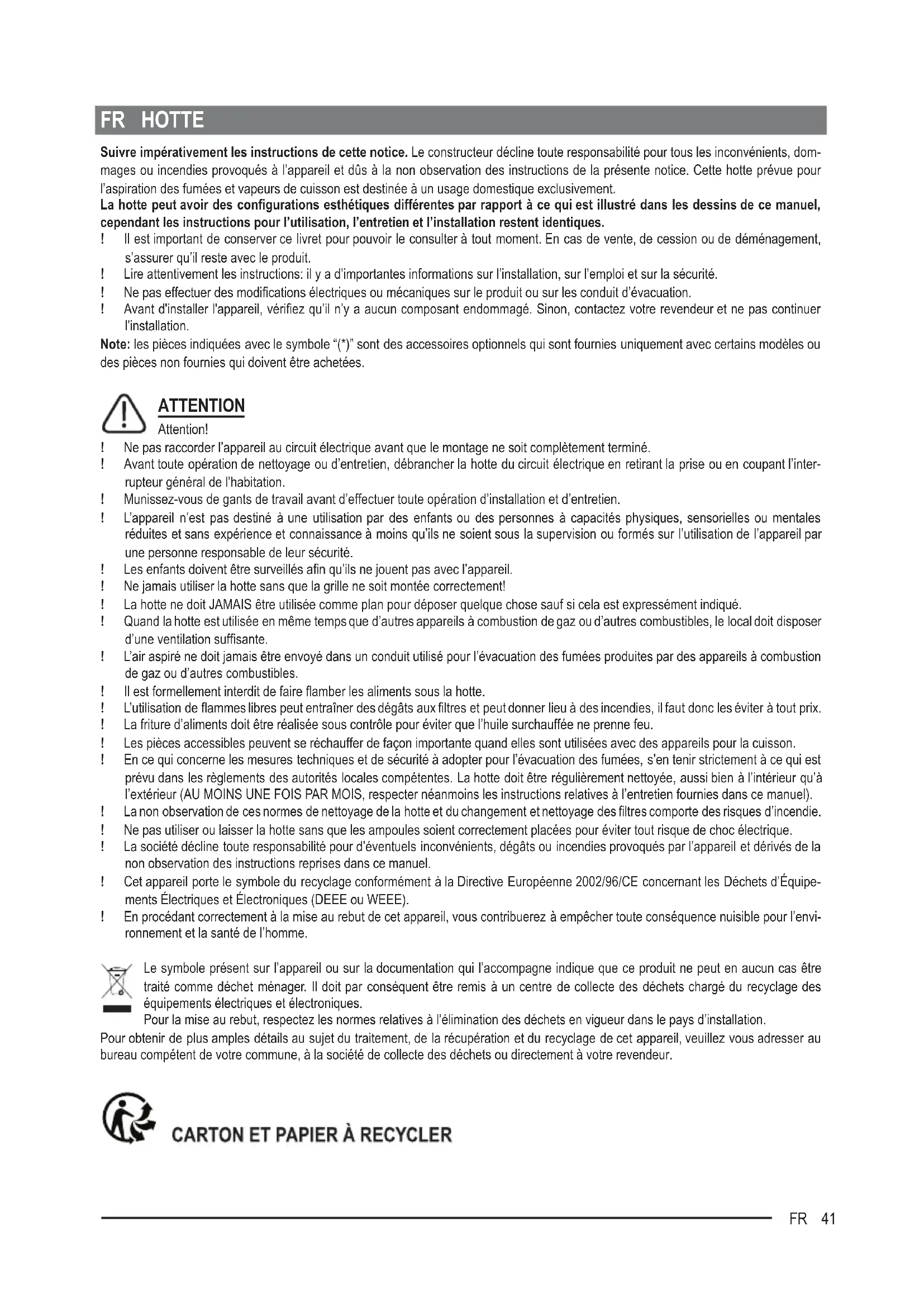 - CEM: EN 55014-1; CISPR 14-1; EN 55014-2; CISPR 14-2; EN/CEI 61000-3-2; EN/CEI 61000-3-3. Suggestions pour une utilisation correcte an de réduire l’impact environnemental: Allumer la hotte à la vitesse minimum pendant la cuisson et la laisser fonctionner pendant quelques minutes après la n de la cuisson. Augmenter la vitesse uniquement en présence d’une grande quantité de fumée ou de vapeur et n’utiliser la/les vitesse(s) accélérées que dans les cas extrêmes. Remplacer le(s) ltre(s) au charbon lorsque cela est nécessaire an de maintenir une réduction efcace des odeurs. Nettoyer le(s) ltres à graisse lorsque cela est nécessaire an de maintenir un ltrage efcace des graisses. Utiliser un système de tuyauterie du diamètre maximum indiqué dans ce manuel an d’optimiser le rendement et de minimiser le bruit. ATTENTION! Ne pas installer les vis et les éléments de xation conformément à ces instructions peut entraîner des risques électriques. UTILISATION La hotte est réalisée de façon qu’elle puisse être utilisée en version aspirante à évacuation extérieure, ou ltrante à recyclage intérieur. Version évacuation extérieure Les vapeurs sont évacuées vers l'extérieur à travers un conduit d'évacuation xé à la bride de raccord qui se trouve audessus de la hotte. Attention! Le tuyau d’évacuation n’est pas fourni et doit être acheté à part. Le diamètre du tuyau d'évacuation doit être égal à celui de la bride de raccord. Sur la partie horizontale, le tuyau doit avoir une légère inclinaison vers le haut (10° env.) de façon à convoyer plus facilement l’air vers l’extérieur. Si la hotte est équipée d'un ltre à charbon, ce dernier doit être enlevé. Relier la hotte aux tubes et trous d’évacuation de la paroi d’un diamètre équivalent à la sortie de l’air (collier de raccord). L’utilisation de tubes et des trous d'évacuation à paroi avec un diamètre inférieur entraînera une diminution des performances d’aspiration et une nette augmentation du bruit. Nous déclinons toute responsabilité à cet égard. ! Utiliser un tuyau de la longueur strictement nécessaire. ! Les coudes du tuyau doivent être en nombre minime (angle maxi du coude: 90°). ! Éviter les variations excessives de section du tuyau. ! Utiliser un tuyau le plus lisse possible sur sa partie interne. ! Le matériau du tuyau doit être aux normes. Version recyclage Il convient d’utiliser un ltre à charbon actif, disponible auprès de vôtre revendeur habituel. L’air aspiré sera dégraissé et désodorisé avant d’être refoulé dans la pièce à travers la grille supérieure. INSTALLATION La distance minimum entre la supercie de support des récipients sur le dispositif de cuisson et la partie la plus basse de la hotte de cuisine ne doit pas être inférieure à 55cm dans le cas de cuisinières électriques et de 65cm dans le cas de cuisinières à gaz ou mixtes. Si les instructions d’installation du dispositif de cuisson au gaz spécient une plus grande distance, il faut en tenir compte. Branchement électrique La tension électrique doit correspondre à la tension reportée sur la plaque signalétique située à l’intérieur de la hotte. Si une prise est présente, branchez la hotte dans une prise murale conforme aux normes en vigueur et placée dans une zone accessible également après l’installation. Si aucune prise n’est présente (raccordement direct au circuit électrique), ou si la prise ne se trouve pas dans une zone accessible également après l’installation, appliquez un disjoncteur normalisé pour assurer de débrancher complètement la hotte du circuit électrique en conditions de catégorie surtension III, conformément aux règlementations de montage. Attention! Avant de rebrancher le circuit de la hotte à l’alimentation électrique et d’en vérier le fonctionnement correct, contrôlez toujours que le câble d’alimentation soit monté correctement. La hotte est pourvue d'un câble d'alimentation spécial; en cas de détérioration du câble, en demander un neuf au service d'assistance technique.43FR Montage Appareil excessivement lourd ; la manutention et l’installation de la hotte doivent être effectuées par deux personnes ou plus. Avant de commencer l’installation: